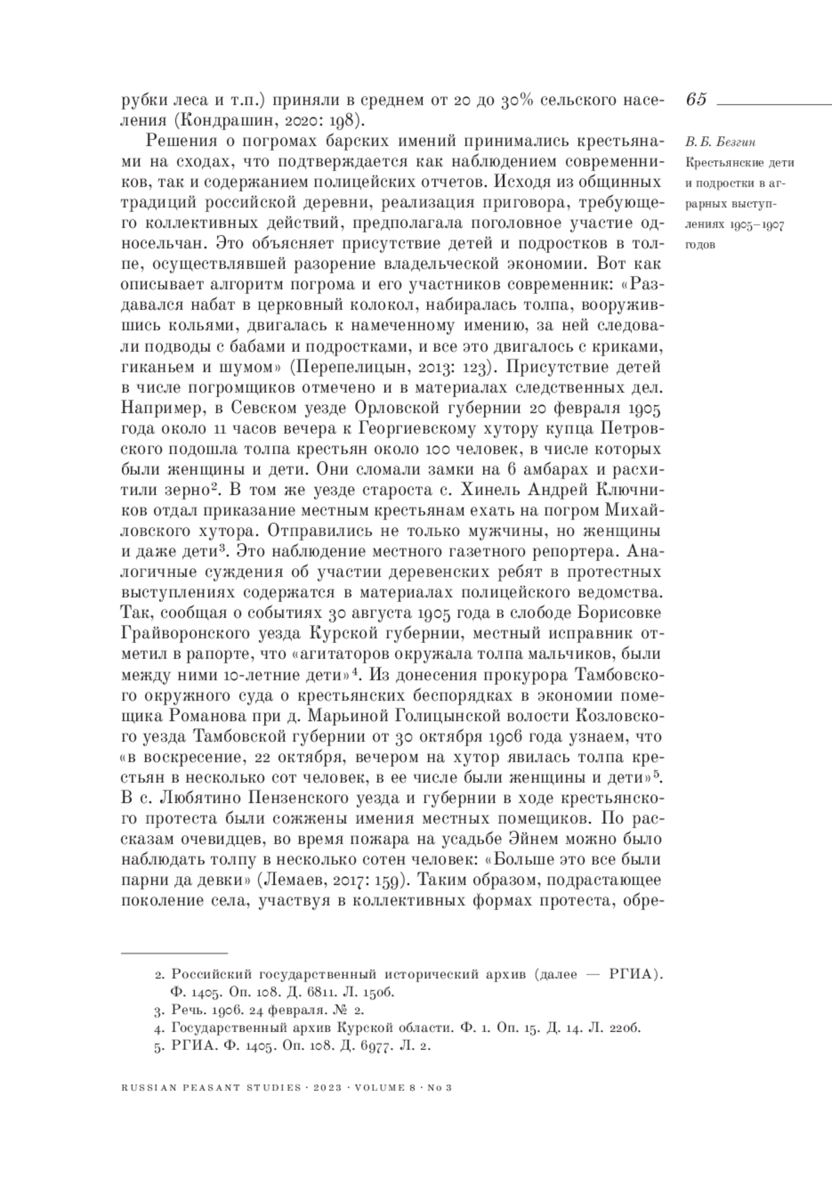 Статья посвящена изучению роли «поколения революционного перелома» - родившихся в 1890-е годы - в аграрном движении 1905-1907 годов. Источниковую базу статьи составили архивные документы и материалы периодической печати. На основе содержания губернаторских отчетов, полицейских рапортов, судебных хроник установлено присутствие детей и участие подростков в таких формах крестьянского протеста, как потрава помещичьих полей, разгром и поджог барских усадеб. О степени вовлеченности этой возрастной когорты в протестные действия крестьян свидетельствуют факты гибели и ранения сельских детей в ходе карательных акций, а также упоминания о противоправных действиях деревенских подростков в материалах следственных дел, судебных разбирательств и газетных заметках. Автором установлено, что если малолетние дети были наблюдателями происходящих событий, то сельские отроки, наряду со взрослыми крестьянами, играли в них активную роль, а порой выступали и в качестве зачинщиков беспорядков. В результате проведенного исследования сделан вывод о том, что участие детей и подростков в аграрном движении обусловлено характером коллективных действий общины и традиционным отношением крестьян к «чужой» собственности. Полученный подрастающим поколением села опыт крестьянского протеста впоследствии проявился в ходе «черного передела» 1917 года.