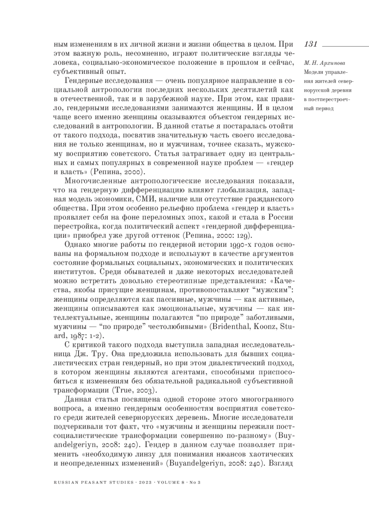 Статья посвящена управленческим практикам жителей севернорусских деревень в постперестроечный период. На примере полевого этнологического материала автора были рассмотрены практики руководителей сельских администраций одного из районов Архангельской области. В качестве источника использованы этнографические интервью с жителями деревень Архангельской области, которые с 1990-х годов занимали или продолжают занимать руководящие должности в сельских администрациях. Как показали эти интервью, многие из жителей деревень Русского Севера с ностальгией вспоминают советские годы, наделяя это время особыми признаками, такими как «стабильность», «коллективизм», «взаимопомощь», «уверенность в будущем». Автор приходит к выводу о наличии некоторой корреляции между гендерной принадлежностью руководителя и теми моделями управления, которые он выбирает. Так, женщины в своей работе чаще апеллируют к принципам коллективизма и взаимопомощи, они акцентируют внимание на помощи тем, кого считают наиболее уязвимыми категориями населения в своих деревнях (безработные, матери-одиночки и проч.). Мужчины-управленцы выбирают иную модель работы: зачастую используют административный ресурс, подключают личные связи, при этом редко упоминают социальную помощь нуждающимся односельчанам. Исследование показало, что в постсоветской деревне произошел своеобразный симбиоз нескольких управленческих моделей, которые имеют гендерные особенности в своей реализации на практике.