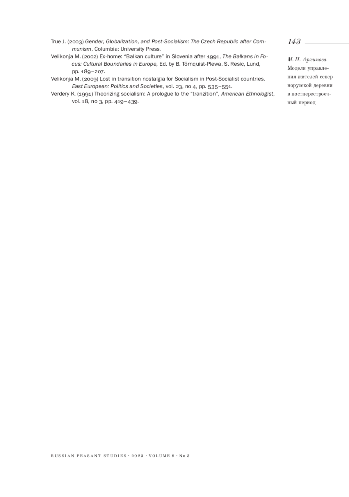 16. 	Verdery K. (1991). Theorizing socialism: A prologue to the “tranzition” // American Ethnologist. Vol. 18. № 3. P. 419-439.  EDN: HERSIF