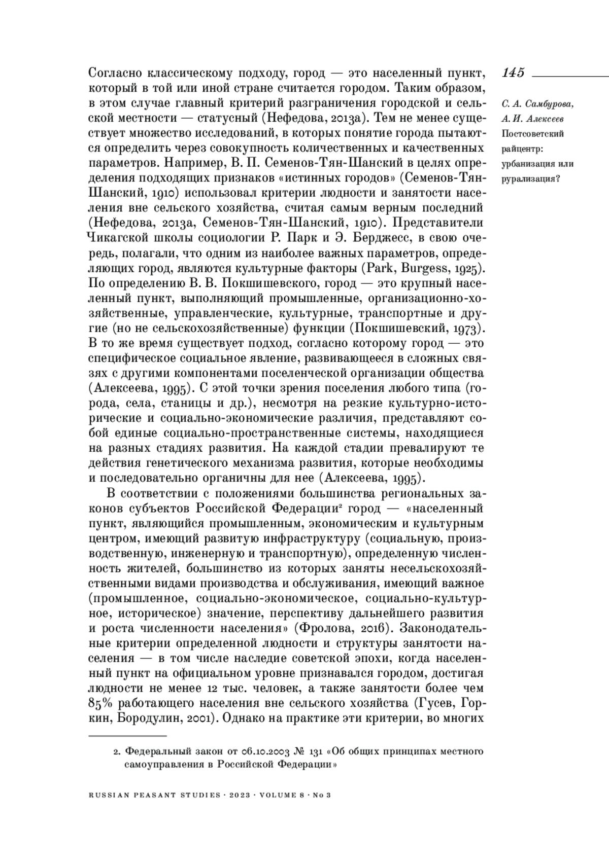 Согласно классическому подходу, город — это населенный пункт, который в той или иной стране считается городом. Таким образом, в этом случае главный критерий разграничения городской и сельской местности — статусный (Нефедова, 2013a). Тем не менее существует множество исследований, в которых понятие города пытаются определить через совокупность количественных и качественных параметров. Например, В. П. Семенов-Тян-Шанский в целях определения подходящих признаков «истинных городов» (Семенов-ТянШанский, 1910) использовал критерии людности и занятости населения вне сельского хозяйства, считая самым верным последний (Нефедова, 2013a, Семенов-Тян-Шанский, 1910). Представители Чикагской школы социологии Р. Парк и Э. Берджесс, в свою очередь, полагали, что одним из наиболее важных параметров, определяющих город, являются культурные факторы (Park, Burgess, 1925).