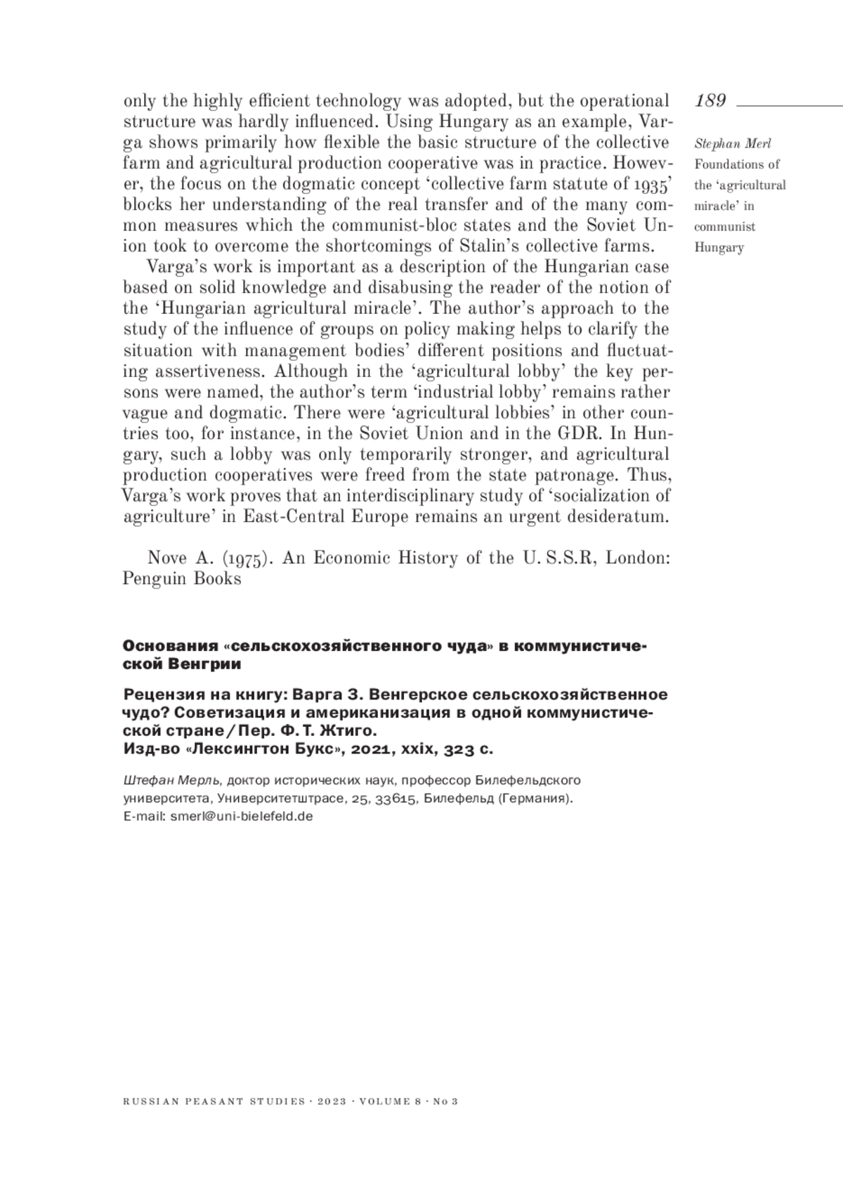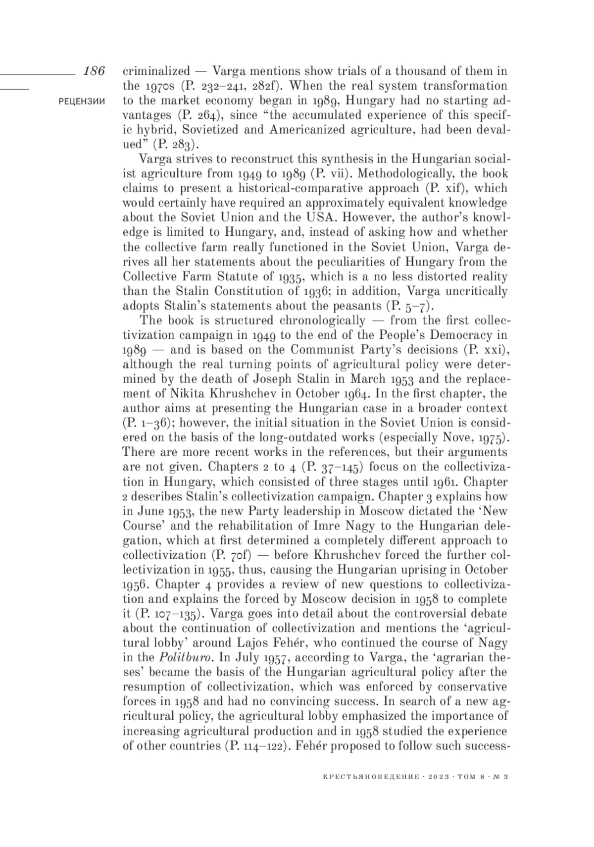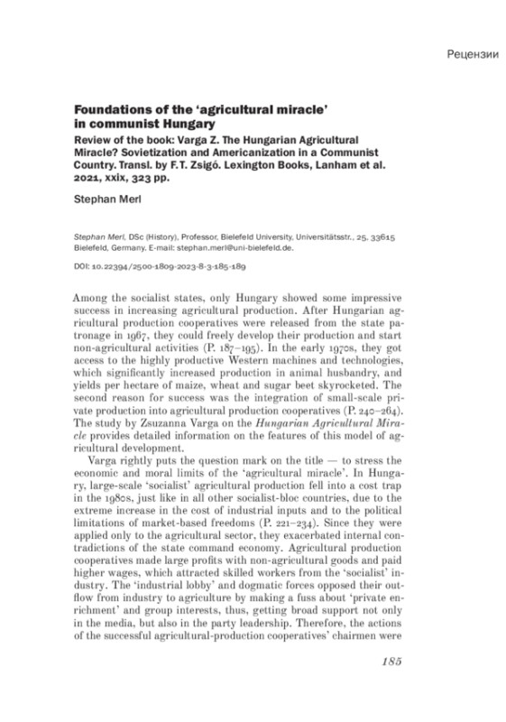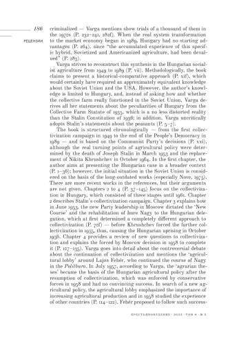 Рецензия на книгу: Варга З. Венгерское сельскохозяйственное чудо? Советизация и американизация в одной коммунистической стране / Пер. Ф. Т. Жтиго. Изд-во «Лексингтон Букс», 2021, xxix, 323 с.
