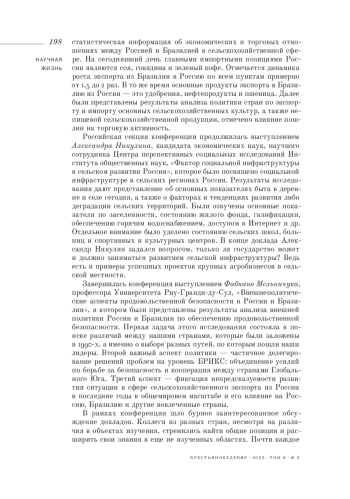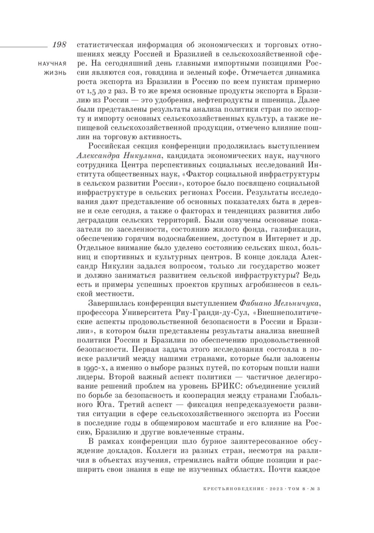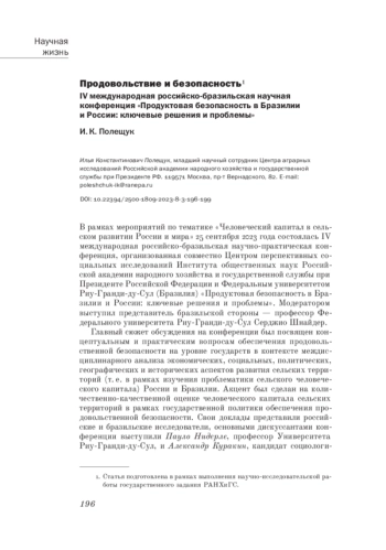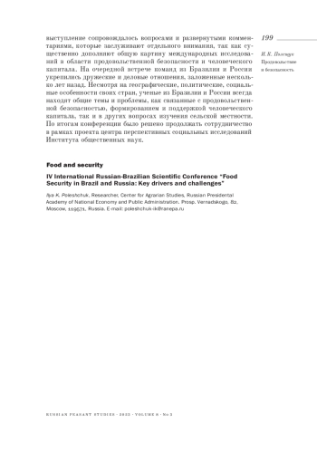 В рамках мероприятий по тематике «Человеческий капитал в сельском развитии России и мира» 25 сентября 2023 года состоялась IV международная российско-бразильская научно-практическая конференция, организованная совместно Центром перспективных социальных исследований Института общественных наук Российской академии народного хозяйства и государственной службы при Президенте Российской Федерации и Федеральным университетом Риу-Гранди-ду-Сул (Бразилия) «Продуктовая безопасность в Бразилии и России: ключевые решения и проблемы». Модератором выступил представитель бразильской стороны — профессор Федерального университета Риу-Гранди-ду-Сул Серджио Шнайдер.