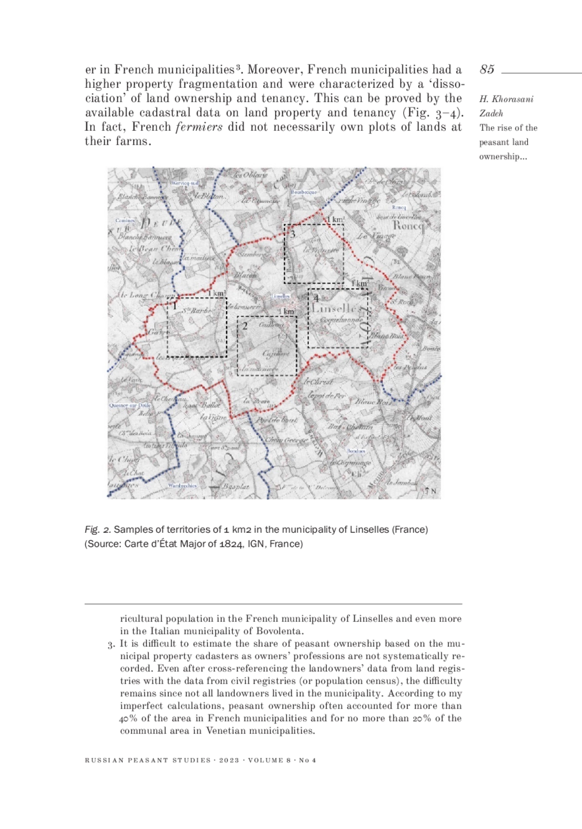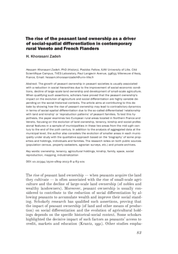 The growth of peasant ownership in peasant societies is usually associated with a reduction in social hierarchies due to the improvement of social-economic conditions, decline of large-scale land ownership and development of small-scale agriculture. When qualifying such assertions, scholars have proved that the peasant ownership’s impact on the evolution of agriculture and social differentiation are highly variable depending on the social-historical contexts. The article aims at contributing to this debate by showing how the rise of peasant ownership may lead to contradictory dynamics in terms of social-spatial differentiation due to the so-called differentiated ‘relationship with land and kinship’ or ‘reproduction patterns’ of peasant families. To test this hypothesis, the paper examines two European rural areas located in Northern France and Veneto, focusing on the evolution of land ownership, tenancy, kinship and social-professional features in a sample of municipalities in these two areas from the mid-19th century to the end of the 20th century. In addition to the analysis of aggregated data at the municipal level, the author also considers the evolution of smaller areas in each municipality under study with the qualitative approach based on the ‘biography’ of some properties and holdings, individuals and families. The research relies on both public sources (population census, property cadasters, agrarian surveys, etc.) and private archives.