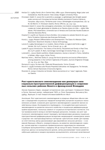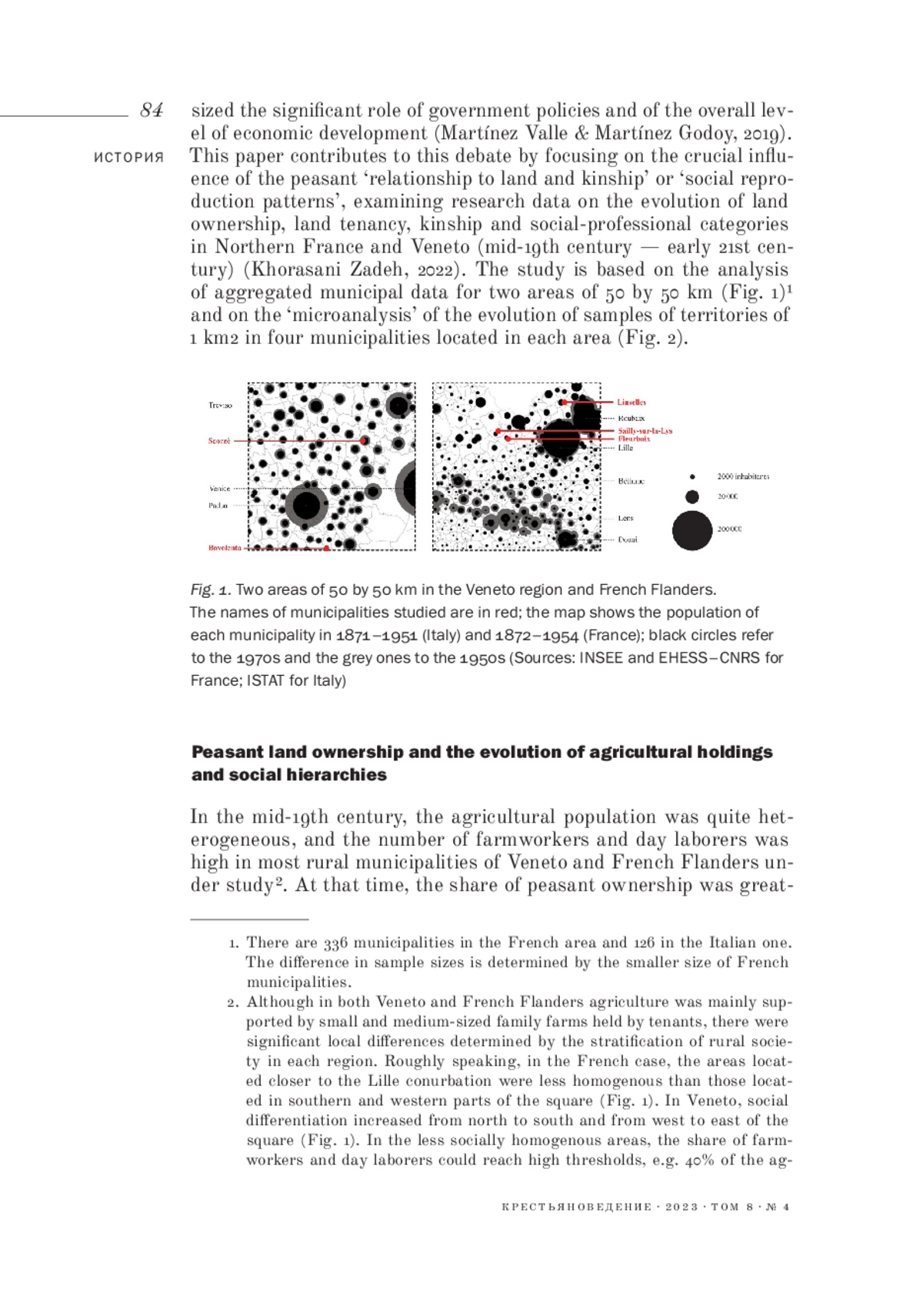 Рост крестьянского землевладения в аграрных обществах обычно связан с сокращением социальных иерархий вследствие улучшения социально-экономических условий, снижения доли крупного землевладения и развития мелких хозяйственных форм. Исследователи подтвердили, что воздействие крестьянского землевладения на развитие сельского хозяйства и социальную дифференциацию крайне вариативно, поскольку зависит от социально-исторического контекста. Статья призвана внести вклад в соответствующие дискуссии, показав, как рост крестьянского землевладения может порождать противоречивую динамику социально-пространственной дифференциации вследствие неоднородной «взаимосвязи земли и родства» или «воспроизводственных паттернов» крестьянских семей. Для проверки этой гипотезы автор рассматривает два европейских сельских региона - в северной Франции и Венето, сосредоточившись на развитии землевладения и аренды, систем родства и социально-профессиональных характеристик населения в выборке муниципалитетов с середины XIX до конца ХХ века. Помимо анализа совокупных данных на муниципальном уровне, автор рассматривает также развитие небольших районов в каждом изучаемом муниципалитете, используя качественный подход - «биографическое» описание некоторых видов собственности, землевладений, конкретных крестьян и их семей. Исследование опирается на такие открытые источники, как переписи населения, кадастровые записи и аграрные опросы, включая интервью и обращение к частным архивам.