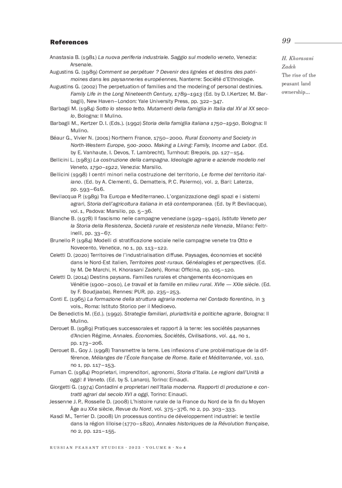 13. 	Celetti D. (2014) Destins paysans. Familles rurales et changements économiques en Vénétie (1900-2010), Le travail et la famille en milieu rural. XVIe - XXIe siècle. (Ed. by F. Boudjaaba), Rennes: PUR, pp. 235-253.