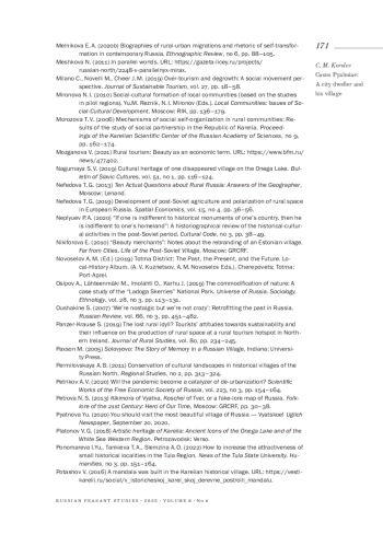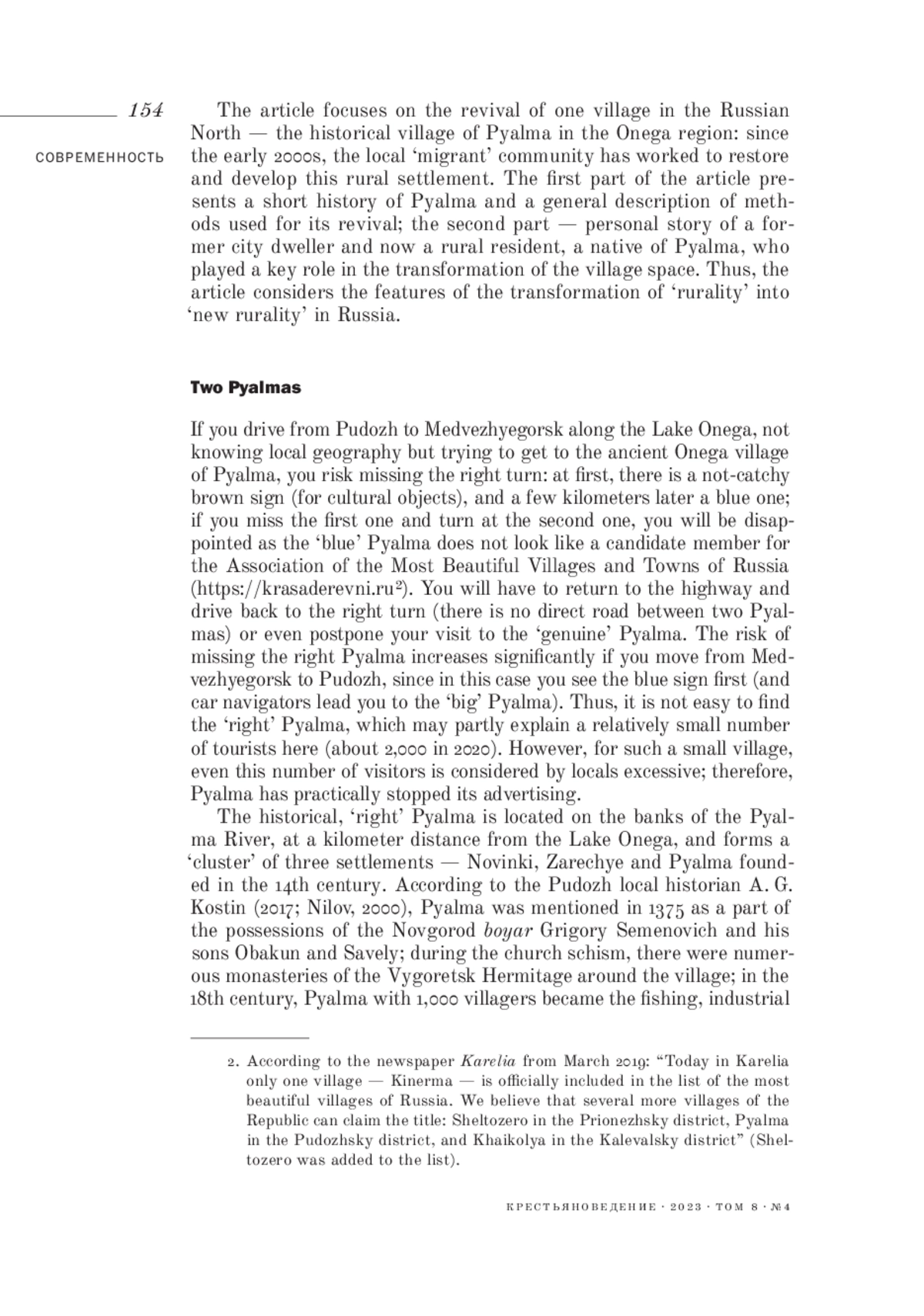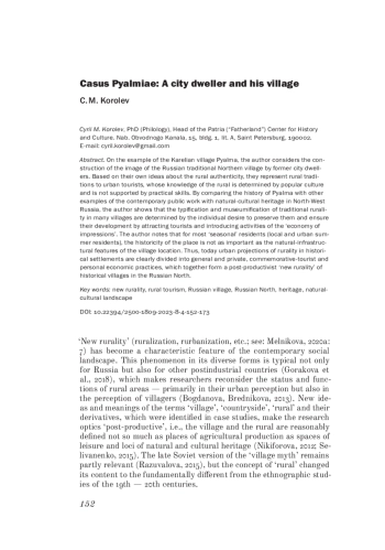 On the example of the Karelian village Pyalma, the author considers the construction of the image of the Russian traditional Northern village by former city dwellers. Based on their own ideas about the rural authenticity, they represent rural traditions to urban tourists, whose knowledge of the rural is determined by popular culture and is not supported by practical skills. By comparing the history of Pyalma with other examples of the contemporary public work with natural-cultural heritage in North-West Russia, the author shows that the typification and museumification of traditional rurality in many villages are determined by the individual desire to preserve them and ensure their development by attracting tourists and introducing activities of the ‘economy of impressions’. The author notes that for most ‘seasonal’ residents (local and urban summer residents), the historicity of the place is not as important as the natural-infrastructural features of the village location. Thus, today urban projections of rurality in historical settlements are clearly divided into general and private, commemorative-tourist and personal economic practices, which together form a post-productivist ‘new rurality’ of historical villages in the Russian North.