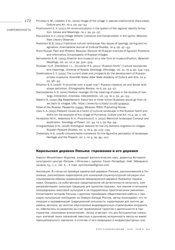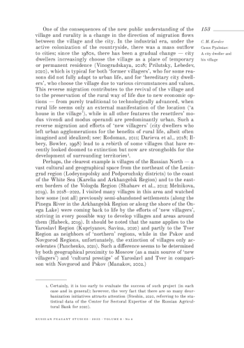 ‘New rurality’ (ruralization, rurbanization, etc.; see: Melnikova, 2020a: 7) has become a characteristic feature of the contemporary social landscape. This phenomenon in its diverse forms is typical not only for Russia but also for other postindustrial countries (Gorakova et al., 2018), which makes researchers reconsider the status and functions of rural areas — primarily in their urban perception but also in the perception of villagers (Bogdanova, Brednikova, 2013). New ideas and meanings of the terms ‘village’, ‘countryside’, ‘rural’ and their derivatives, which were identified in case studies, make the research optics ‘post-productive’, i. e., the village and the rural are reasonably defined not so much as places of agricultural production as spaces of leisure and loci of natural and cultural heritage (Nikiforova, 2012; Selivanenko, 2015). The late Soviet version of the ‘village myth’ remains partly relevant (Razuvalova, 2015), but the concept of ‘rural’ changed its content to the fundamentally different from the ethnographic studies of the 19th — 20th centuries.