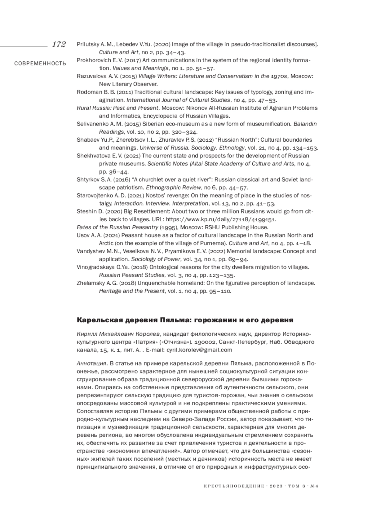 25. 	Kupriyanov P. S., Savina N. A. (2020) Contemporary museum of the Russian village: Production of rural life by former city dwellers]. Ethnographic Review, no 6, pp. 12-30.  EDN: YOCUUU