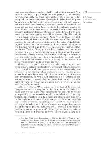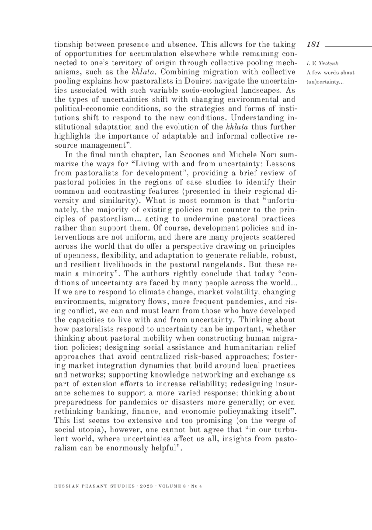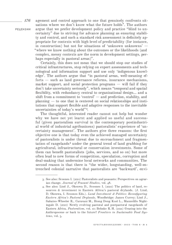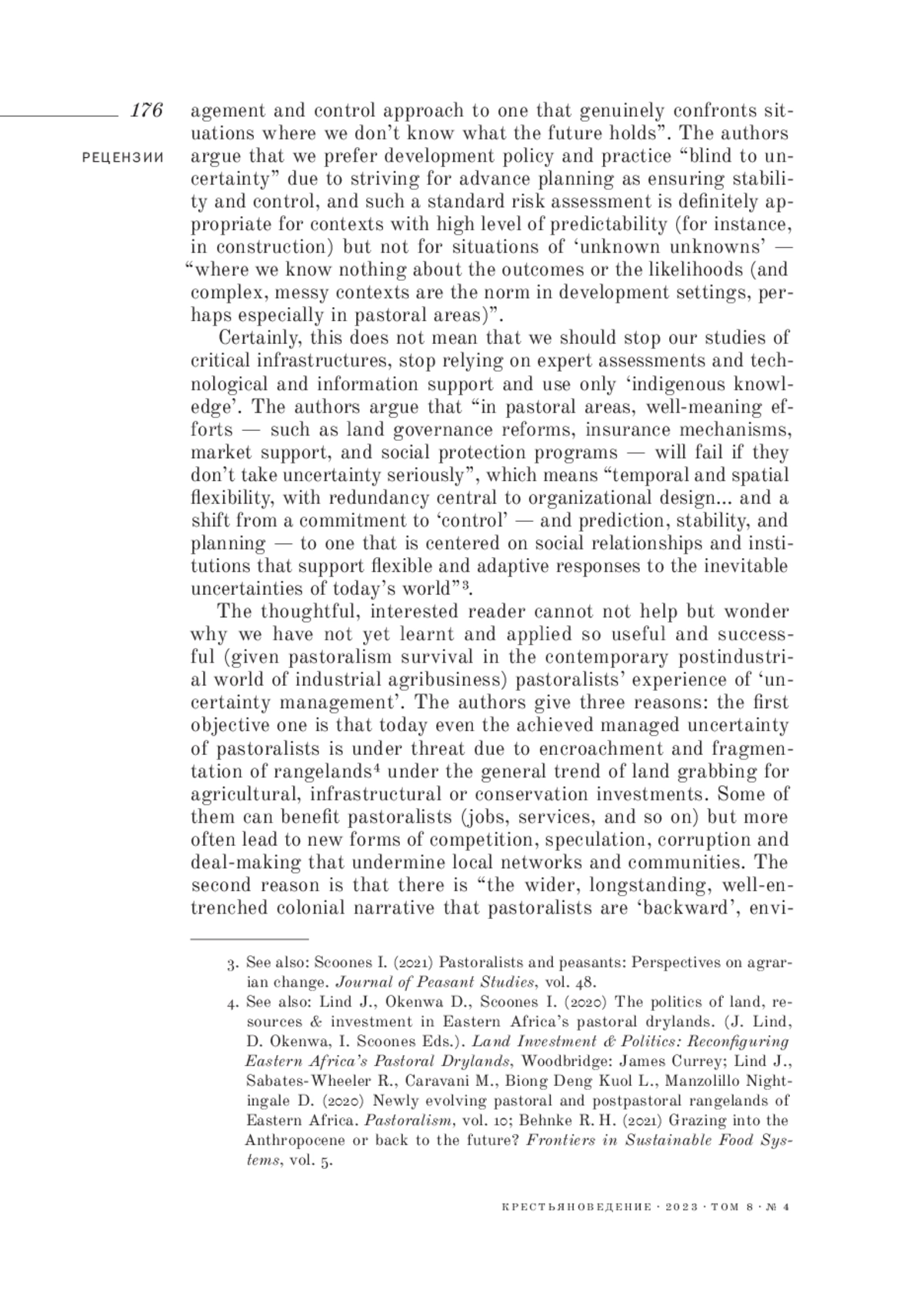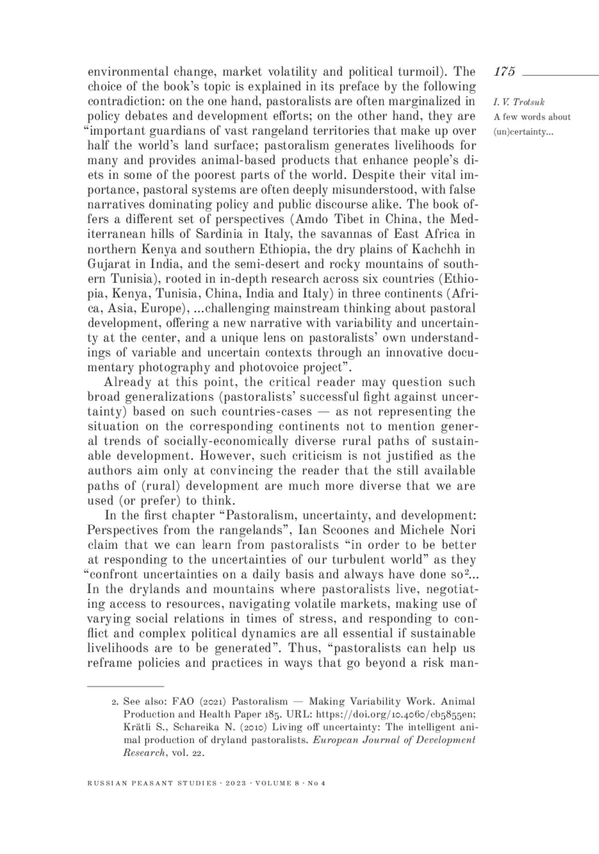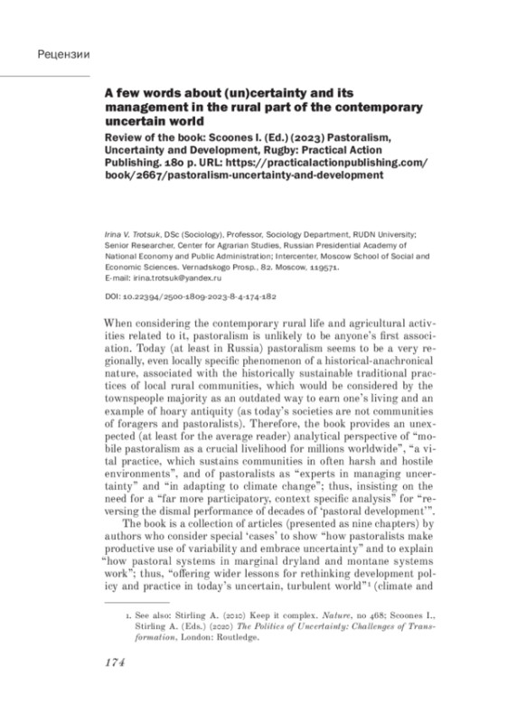 Review of the book: Scoones I. (Ed.) (2023) Pastoralism, Uncertainty and Development, Rugby: Practical Action Publishing. 180 p. URL: https://practicalactionpublishing. com/ book/2667/pastoralism-uncertainty-and-development