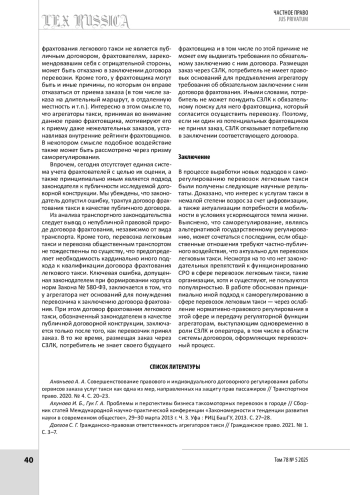 1. Ананьева А. А. Совершенствование правового и индивидуального договорного регулирования работы сервисов заказа услуг такси как одна из мер, направленных на защиту прав пассажиров // Транспортное право. 2020. № 4. С. 20-23.