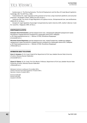7. Краснова С. А. Гражданско-правовой статус операторов онлайн-платформ: неопределенное настоящее и возможное будущее // Имущественные отношения в Российской Федерации. 2022. № 1. С. 67-82 ; № 2. С. 76-86.