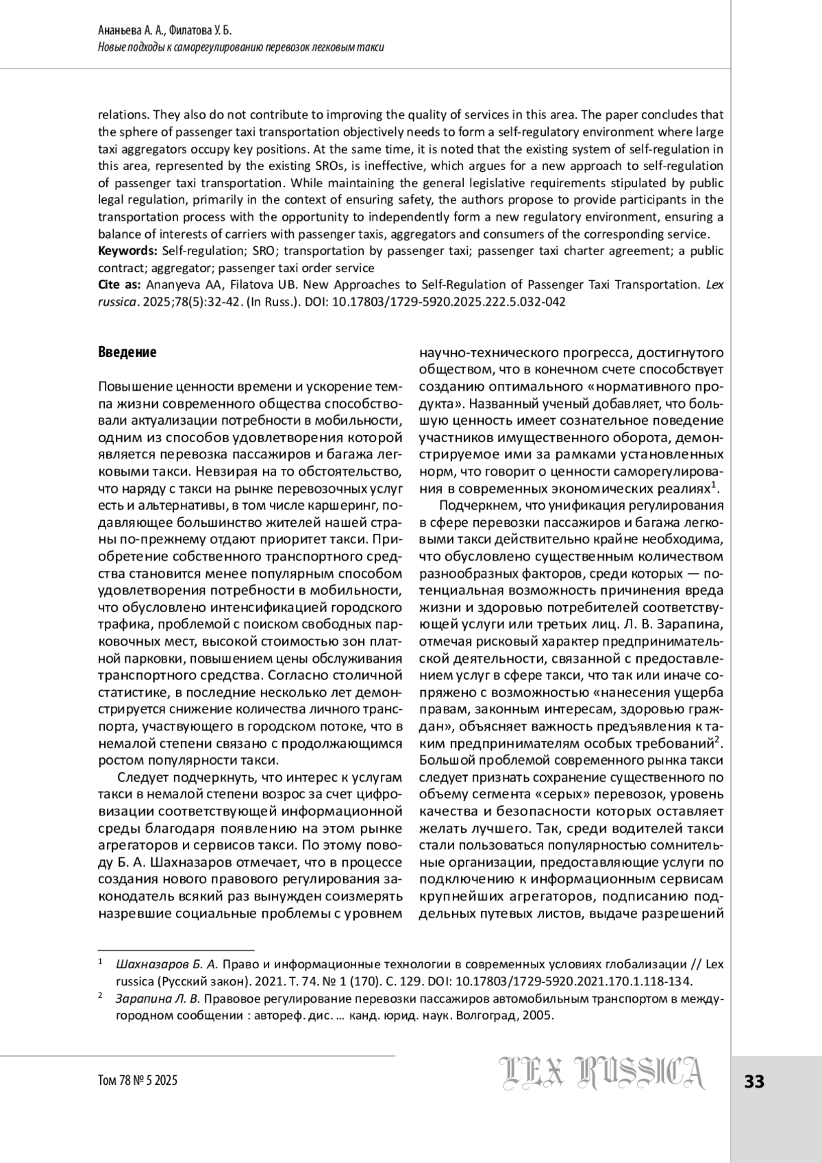 Повышение ценности времени и ускорение темпа жизни современного общества способствуют постоянному росту спроса на услуги такси, несмотря на то что удовлетворение потребности в мобильности возможно и иными способами, в том числе путем каршеринга или приобретения собственного транспортного средства. В условиях цифровизации и популяризации платформенных решений, в числе которых и сервисы служб заказа легкового такси, спрос на перевозку этим видом транспорта неуклонно возрастает. Констатируется, что нормативные правовые акты, направленные на регулирование общественных отношений в сфере перевозок легковым такси, не обеспечивают баланс интересов участников соответствующих правоотношений, а также не способствуют улучшению качества услуг в этой сфере. В работе делается вывод, что сфера перевозок легковым такси объективно нуждается в формировании саморегуляторной среды, в которой ключевые позиции занимают крупные агрегаторы такси. При этом сложившаяся система саморегулирования, представленная действующими СРО, неэффективна, чем аргументирован новый подход к саморегулированию перевозок легковым такси. Предлагается, сохранив общие законодательные требования, обусловленные публично-правовым регулированием прежде всего с позиции обеспечения безопасности, предоставить участникам перевозочного процесса возможность самостоятельно формировать новую регуляторную среду, обеспечивая баланс интересов перевозчиков легковым такси, агрегаторов и потребителей соответствующей услуги.