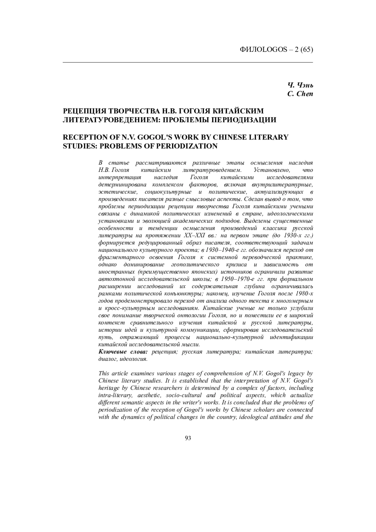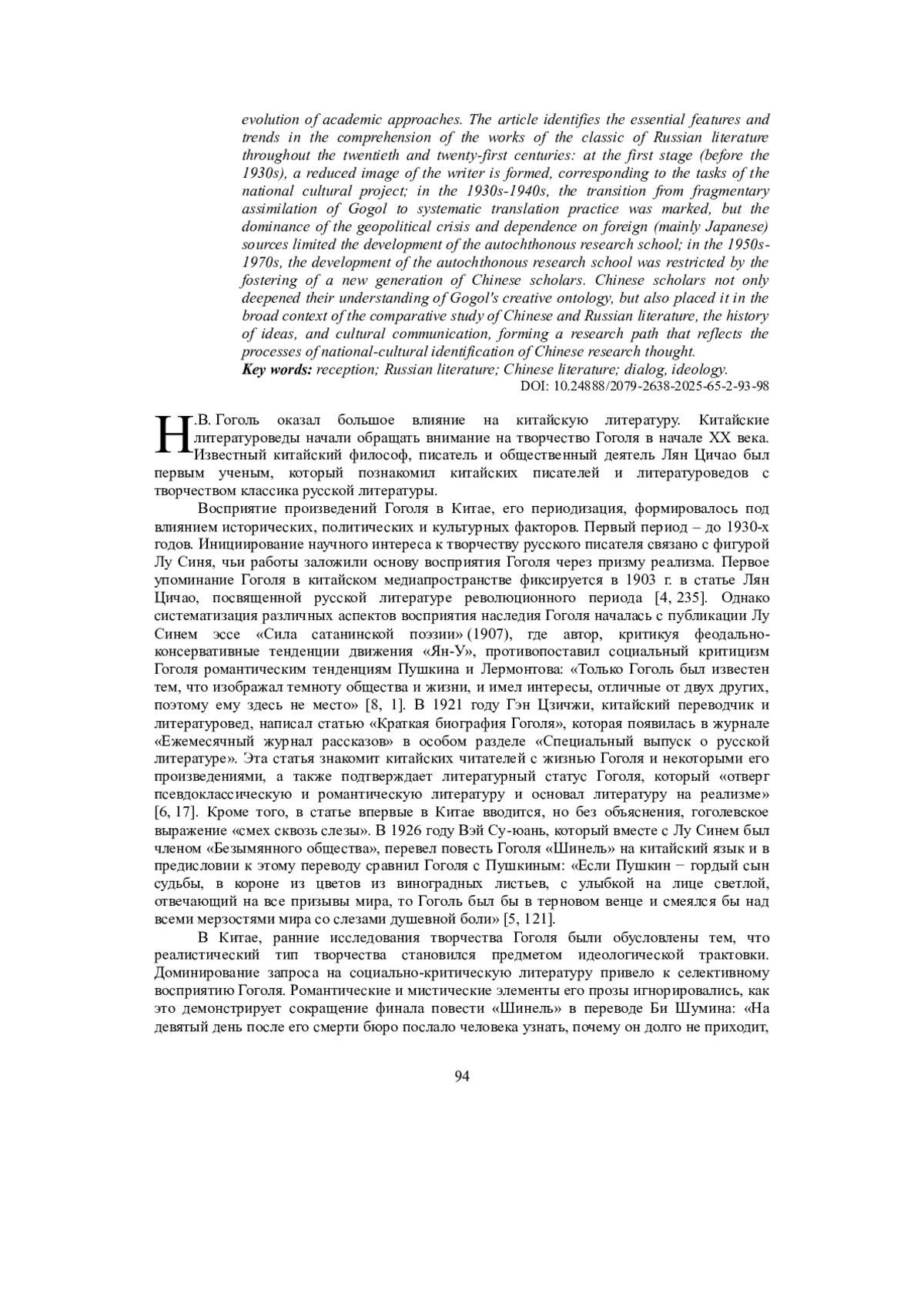 В статье рассматриваются различные этапы осмысления наследия Н. В. Гоголя китайским литературоведением. Установлено, что интерпретация наследия Гоголя китайскими исследователями детерминирована комплексом факторов, включая внутрилитературные, эстетические, социокультурные и политические, актуализирующих в произведениях писателя разные смысловые аспекты. Сделан вывод о том, что проблемы периодизации рецепции творчества Гоголя китайскими учеными связаны с динамикой политических изменений в стране, идеологическими установками и эволюцией академических подходов. Выделены существенные особенности и тенденции осмысления произведений классика русской литературы на протяжении ХХ-ХХI вв.: на первом этапе (до 1930-х гг.) формируется редуцированный образ писателя, соответствующий задачам национального культурного проекта; в 1930-1940-е гг. обозначился переход от фрагментарного освоения Гоголя к системной переводческой практике, однако доминирование геополитического кризиса и зависимость от иностранных (преимущественно японских) источников ограничили развитие автохтонной исследовательской школы; в 1950-1970-е гг. при формальном расширении исследований их содержательная глубина ограничивалась рамками политической конъюнктуры; наконец, изучение Гоголя после 1980-х годов продемонстрировало переход от анализа одного текста к многомерным и кросс-культурным исследованиям. Китайские ученые не только углубили свое понимание творческой онтологии Гоголя, но и поместили ее в широкий контекст сравнительного изучения китайской и русской литературы, истории идей и культурной коммуникации, сформировав исследовательский путь, отражающий процессы национально-культурной идентификации китайской исследовательской мысли.