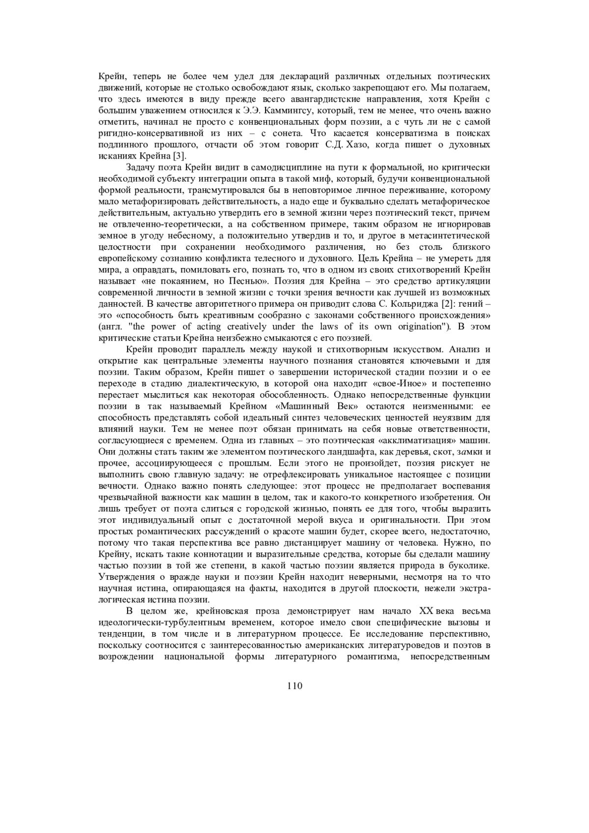 Несмотря на то, что Гарольд Харт Крейн очень известен в США как поэт, и о его вкладе в эссеистику знают, никто не рассматривает его критику как самостоятельное явление. Его письма изданы отдельно в отличие от его критики, и в качестве самодостаточного научного объекта они не рассматриваются. Крейн, само собой, в первую очередь – поэт-продолжатель традиции именно американского, эмерсонианского романтизма, однако реализации Крейна как культурного феномена способствовали не только его стихи. Во многом именно благодаря ему мы узнали, например, о Шервуде Андерсоне, без которого теперь невозможно представить отечественную литературную американистику, особенно ту, которая рассматривает ранний прозаический модернизм в США. Литературоведческое изучение такого важного для США периода, как начало XX века, позволит по-новому взглянуть на причины и основания амбивалентной рецепции и усвоения американской культуры.