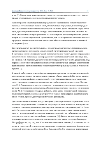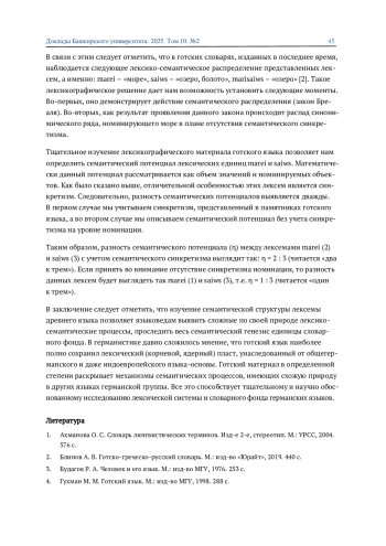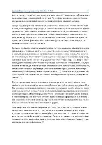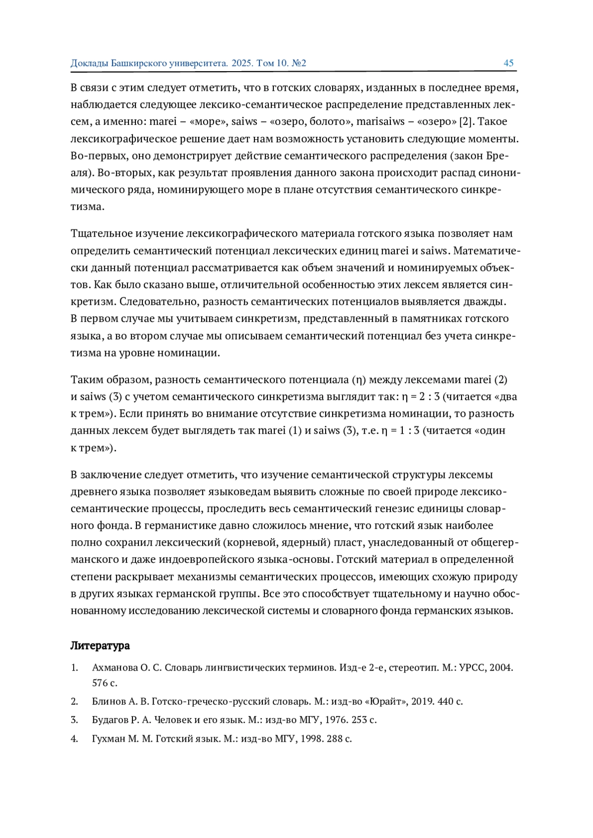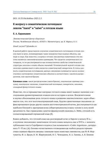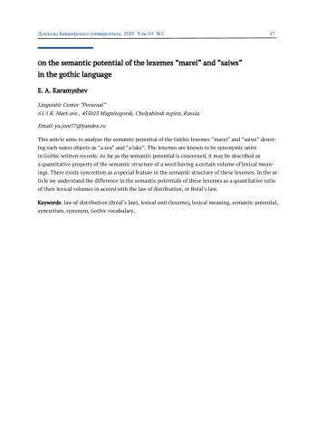 В данной работе представлено изучение семантического потенциала готских лексем marei и saiws, номинирующих такие поверхностные водные объекты, как море и озеро. Как известно, в корпусе готских письменных памятников эти лексемы являются синонимическими единицами. Что касается семантического потенциала, то он рассматривается как количественное свойство семантической структуры лексемы в плане объема значений. Отличительной чертой готских лексических единиц marei и saiws является семантический синкретизм. В статье разность семантических потенциалов данных синонимов понимается как их количественное соотношение семантических объемов в соответствии с законом распределения, или законом Бреаля.