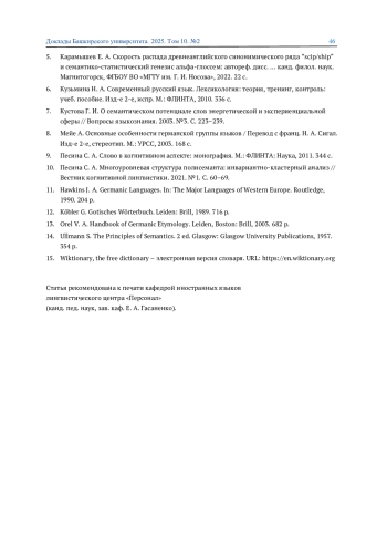 5. Карамышев Е. А. Скорость распада древнеанглийского синонимического ряда “scip/ship” и семантико-статистический генезис альфа-глоссем: автореф. дисс. … канд. филол. наук. Магнитогорск, ФГБОУ ВО “МГТУ им. Г. И. Носова”, 2022. 22 с. EDN: XMSCUL