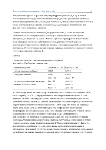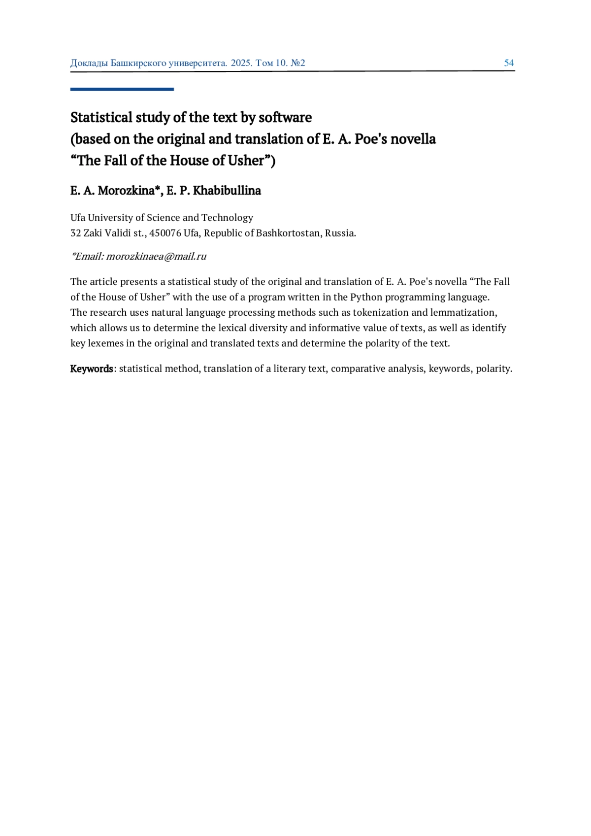 В работе проведено статистическое исследование оригинала и перевода новеллы Э. А. По «Падение дома Ашеров» с использованием программы, написанной на языке программирования «Python». В исследовании используются такие методы обработки естественного языка, как токенизация, лемматизация, что позволяет определить лексическое разнообразие и информативность текстов, а также выявить ключевые лексемы в текстах оригинала и перевода, определить полярность текста.