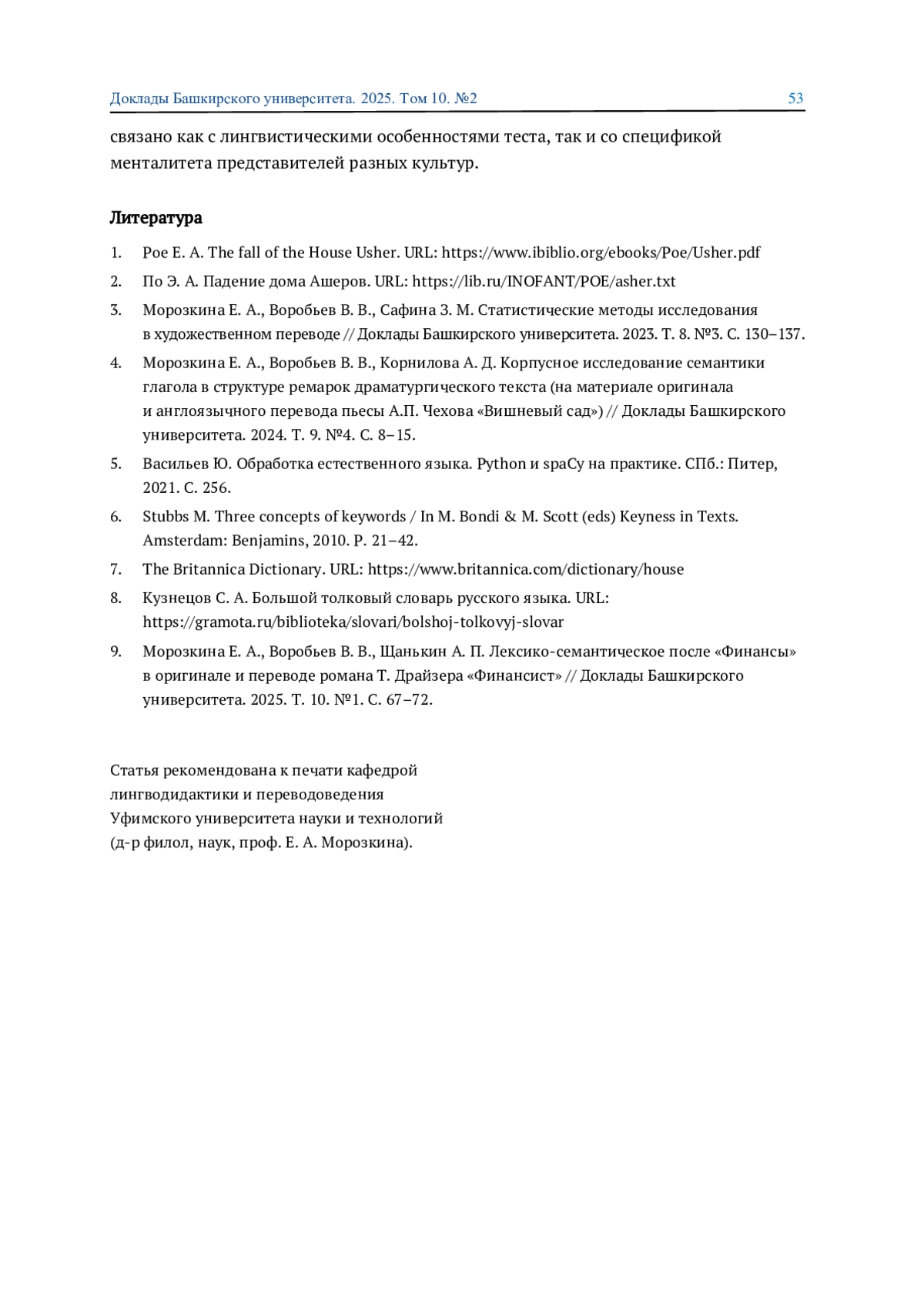 9. 	Морозкина Е. А., Воробьев В. В., Щанькин А. П. Лексико-семантическое после “Финансы” в оригинале и переводе романа Т. Драйзера “Финансист” // Доклады Башкирского университета. 2025. Т. 10. №1. С. 67-72. EDN: ZPKGKD