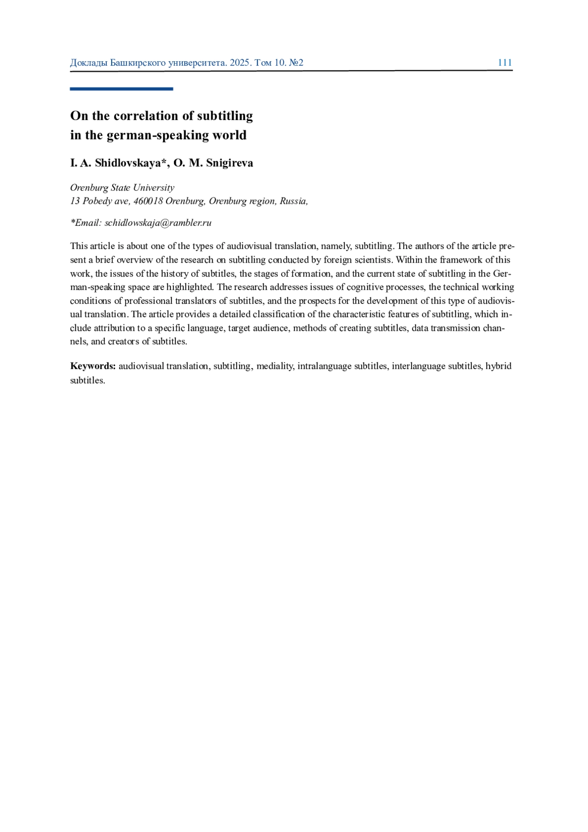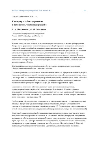 В данной статье речь идет об одном из видов аудиовизуального перевода, а именно, субтитрировании. Авторы статьи представляют краткий обзор исследований субтитрования, проведенных зарубежными учеными. В рамках данной работы освещаются вопросы истории возникновения субтитров, этапы становления и современное состояние субтитрирования в немецкоязычном пространстве. Исследования затрагивают вопросы когнитивных процессов, технические условия труда профессиональных переводчиков субтитров и перспективы развития данного вида аудиовизуального перевода. В статье подробно представлена классификация характерных признаков субтитрирования, к которым относятся отнесенность к конкретному языку, целевая аудитория, способы создания субтитров, каналы передачи данных и создатели субтитров.