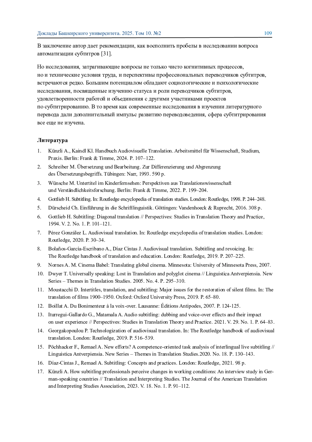 17. Künzli A. How subtitling professionals perceive changes in working conditions: An interview study in German-speaking countries // Translation and Interpreting Studies. The Journal of the American Translation and Interpreting Studies Association, 2023. V. 18. No. 1. P. 91-112.