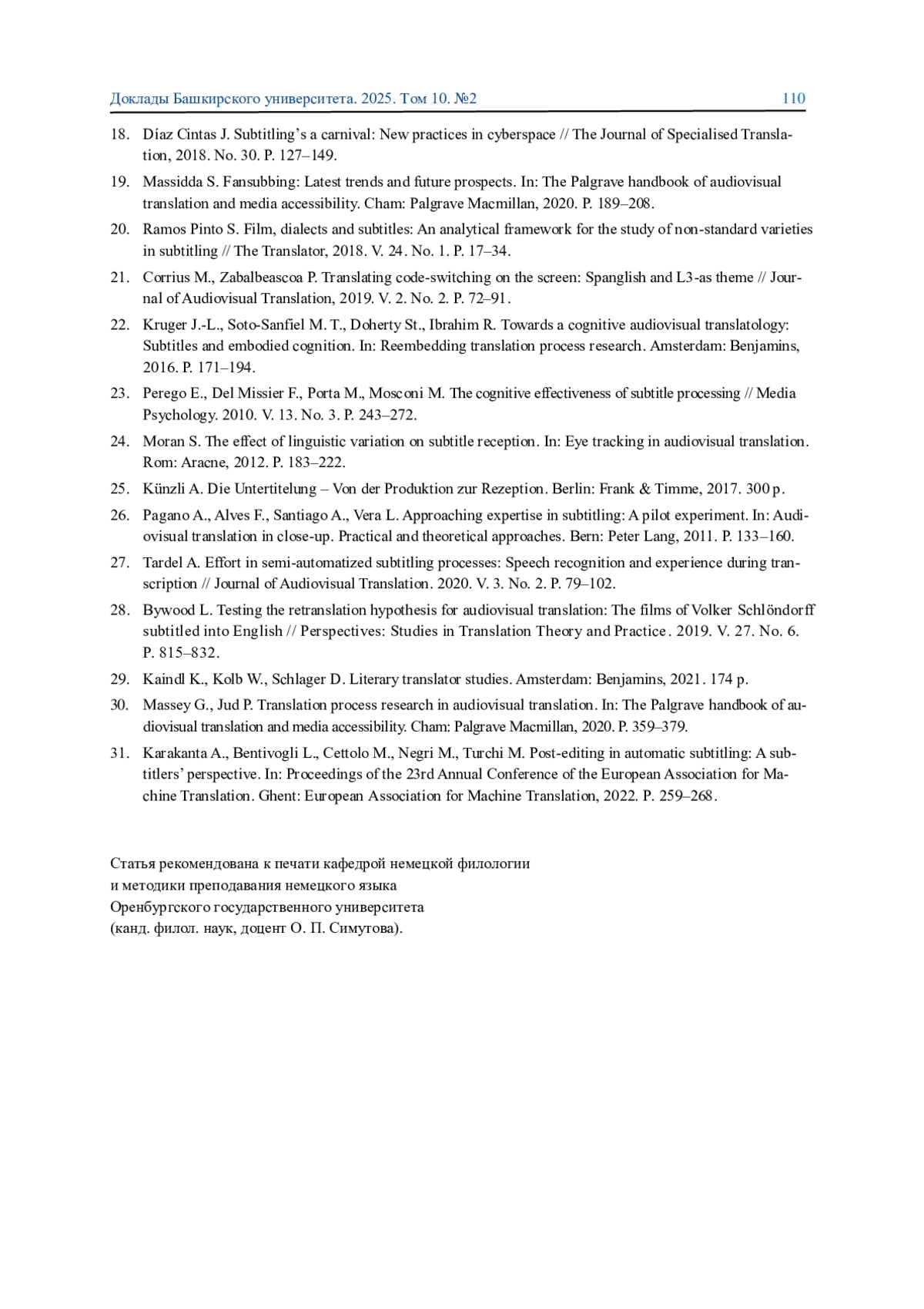 1. Künzli A., Kaindl Kl. Handbuch Audiovisuelle Translation. Arbeitsmittel für Wissenschaft, Studium, Praxis. Berlin: Frank & Timme, 2024. Р. 107-122.