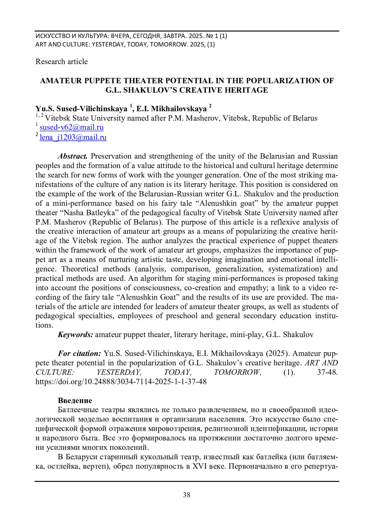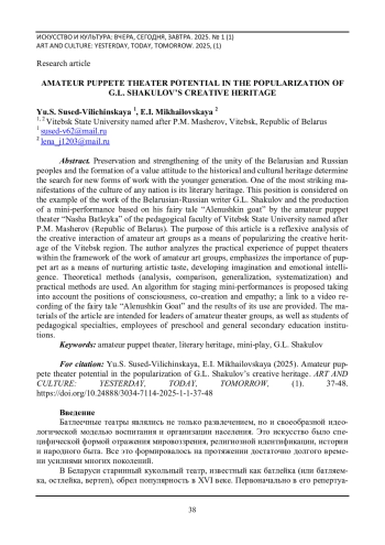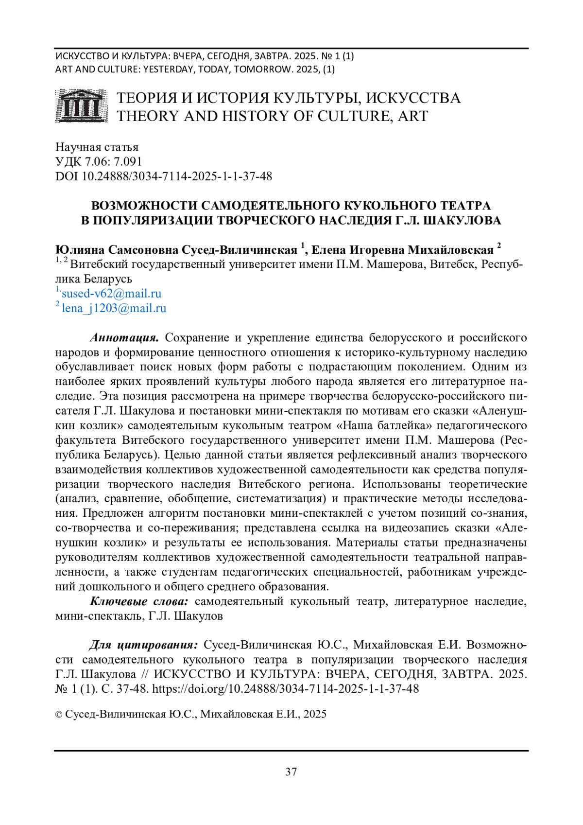 Сохранение и укрепление единства белорусского и российского народов и формирование ценностного отношения к историко-культурному наследию обуславливает поиск новых форм работы с подрастающим поколением. Одним из наиболее ярких проявлений культуры любого народа является его литературное наследие. Эта позиция рассмотрена на примере творчества белорусско-российского писателя Г. Л. Шакулова и постановки мини-спектакля по мотивам его сказки «Аленушкин козлик» самодеятельным кукольным театром «Наша батлейка» педагогического факультета Витебского государственного университет имени П. М. Машерова (Республика Беларусь). Целью данной статьи является рефлексивный анализ творческого взаимодействия коллективов художественной самодеятельности как средства популяризации творческого наследия Витебского региона. Использованы теоретические (анализ, сравнение, обобщение, систематизация) и практические методы исследования. Предложен алгоритм постановки мини-спектаклей с учетом позиций со-знания, со-творчества и со-переживания; представлена ссылка на видеозапись сказки «Аленушкин козлик» и результаты ее использования. Материалы статьи предназначены руководителям коллективов художественной самодеятельности театральной направленности, а также студентам педагогических специальностей, работникам учреждений дошкольного и общего среднего образования.
