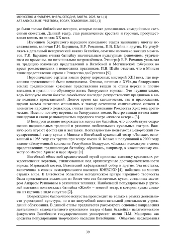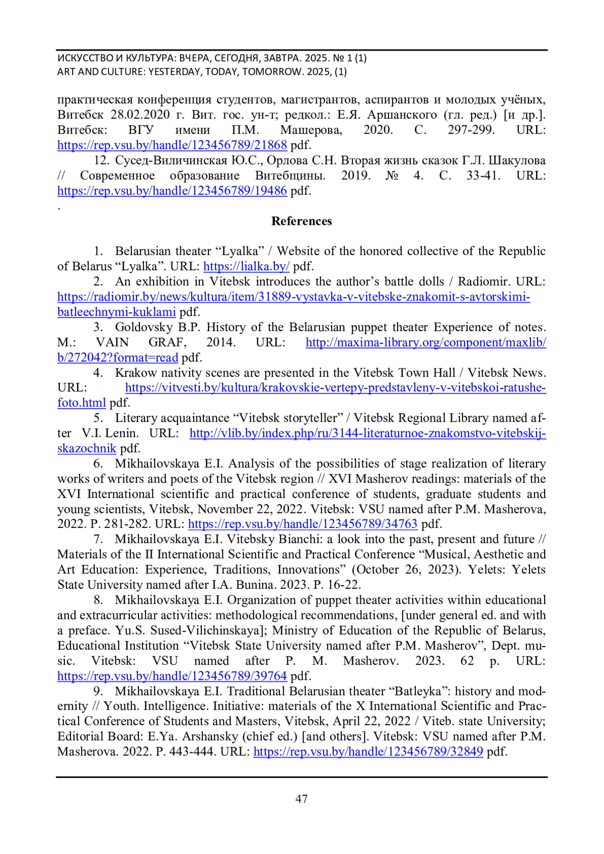 9. Михайловская Е.И. Традиционный белорусский театр “Батлейка”: история и современность // Молодость. Интеллект. Инициатива: материалы X Международной научно-практической конференции студентов и магистрантов, Витебск, 22апреля 2022 г. / Витеб. гос. ун-т; редкол.: Е.Я. Аршанский (гл. ред.) [и др.]. Витебск: ВГУ имени П.М. Машерова. 2022. С. 443-444. URL: https://rep.vsu.by/handle/123456789/32849.pdf.
