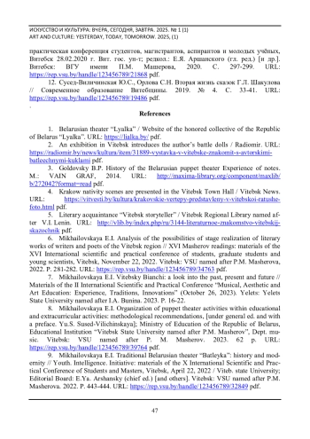6. Михайловская Е.И. Анализ возможностей сценической реализации литературных произведений писателей и поэтов Витебщины // XVI Машеровские чтения: материалы XVI Международной научно-практической конференции студентов, аспирантов и молодых учёных, Витебск, 22 ноября 2022 г. / Витеб. гос. ун-т; редкол.: Е.Я. Аршанский (гл. ред.) [и др.]. Витебск: ВГУ имени П.М. Машерова. 2022. С. 281-282. URL: https://rep.vsu.by/handle/123456789/34763.pdf. EDN: EGVBAI