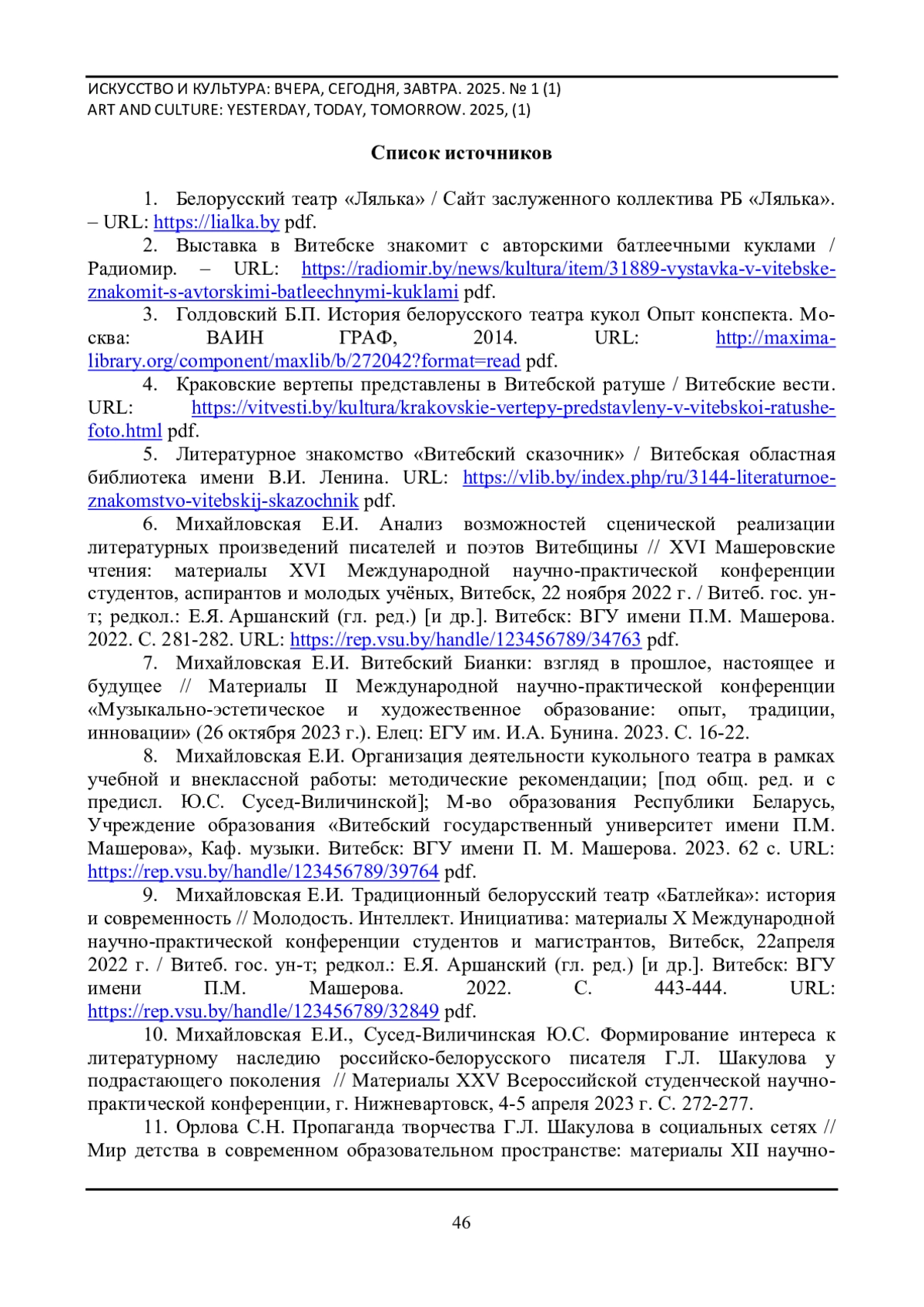 8. Михайловская Е.И. Организация деятельности кукольного театра в рамках учебной и внеклассной работы: методические рекомендации; [под общ. ред. и с предисл. Ю.С. Сусед-Виличинской]; М-во образования Республики Беларусь, Учреждение образования “Витебский государственный университет имени П.М. Машерова”, Каф. музыки. Витебск: ВГУ имени П. М. Машерова. 2023. 62 с. URL: https://rep.vsu.by/handle/123456789/39764.pdf.
