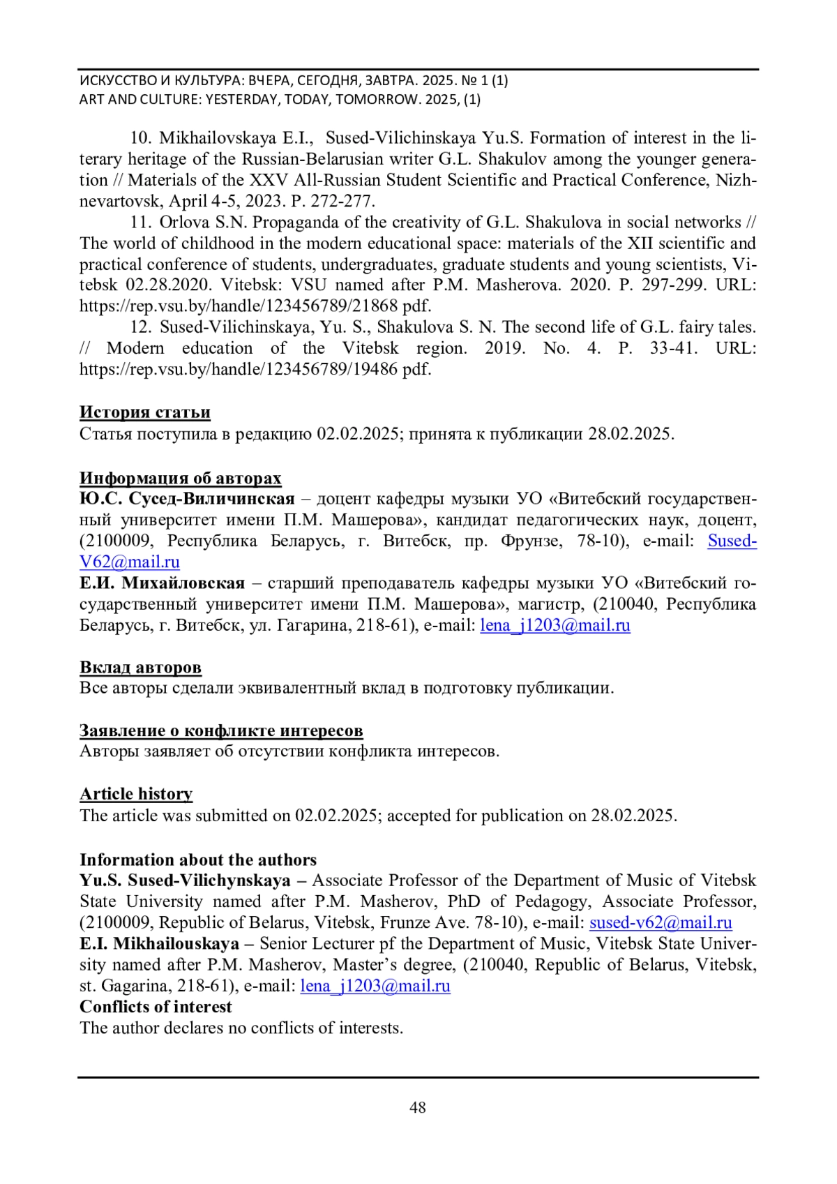 10. Михайловская Е.И., Сусед-Виличинская Ю.С. Формирование интереса к литературному наследию российско-белорусского писателя Г.Л. Шакулова у подрастающего поколения // Материалы XXV Всероссийской студенческой научно-практической конференции, г. Нижневартовск, 4-5 апреля 2023 г. С. 272-277. EDN: KSQOOZ