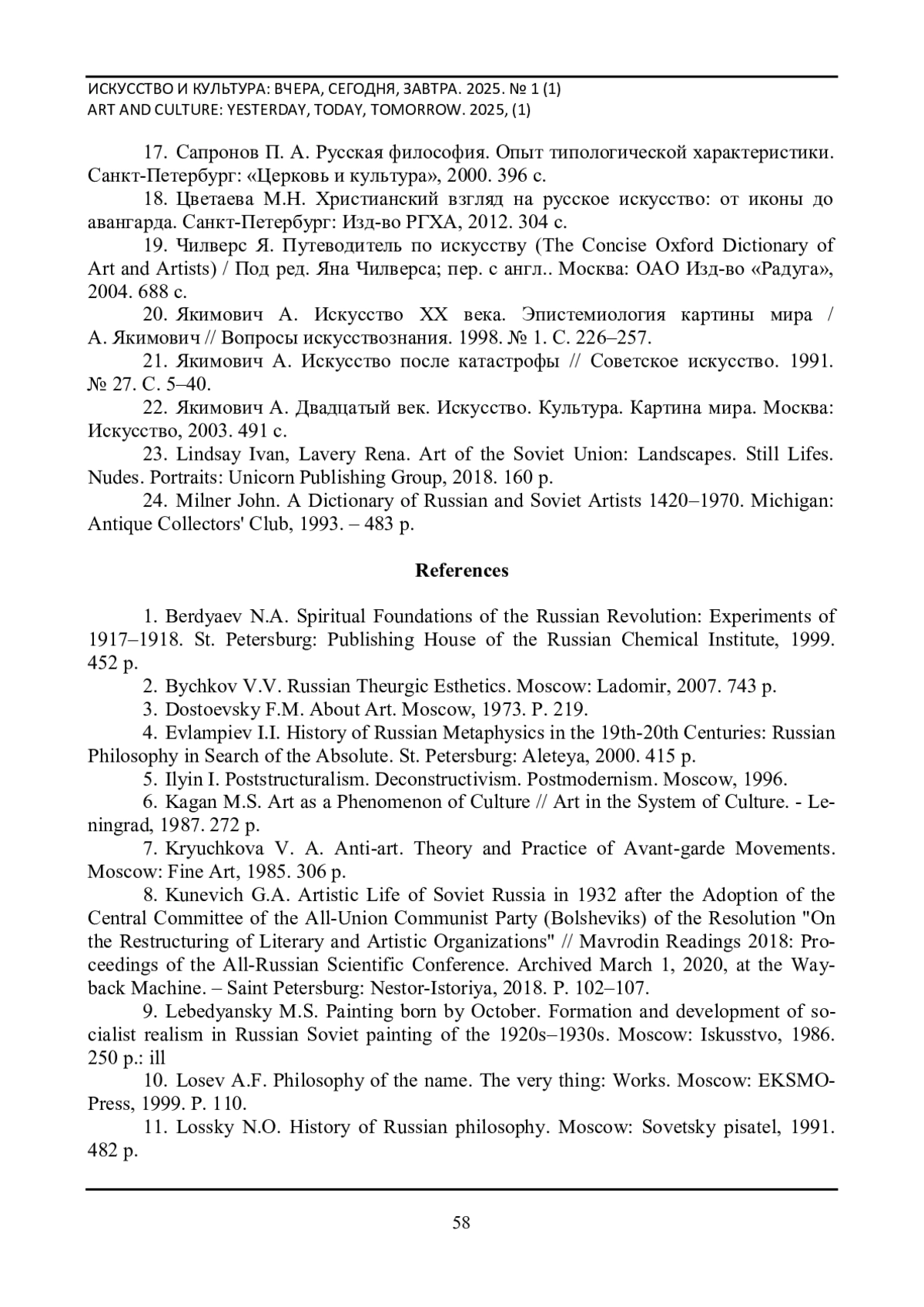 14. 	Матявина А.Е. Художественный авангард и образ культуры XX века: автореферат дис.. канд. филос. наук: 09.00.13. Москва, 2004. 19 с. URL: https://viewer.rsl.ru/ru/rsl01003243474?page=1&rotate=0&theme=white (дата обращения 14.01.2025 г.).