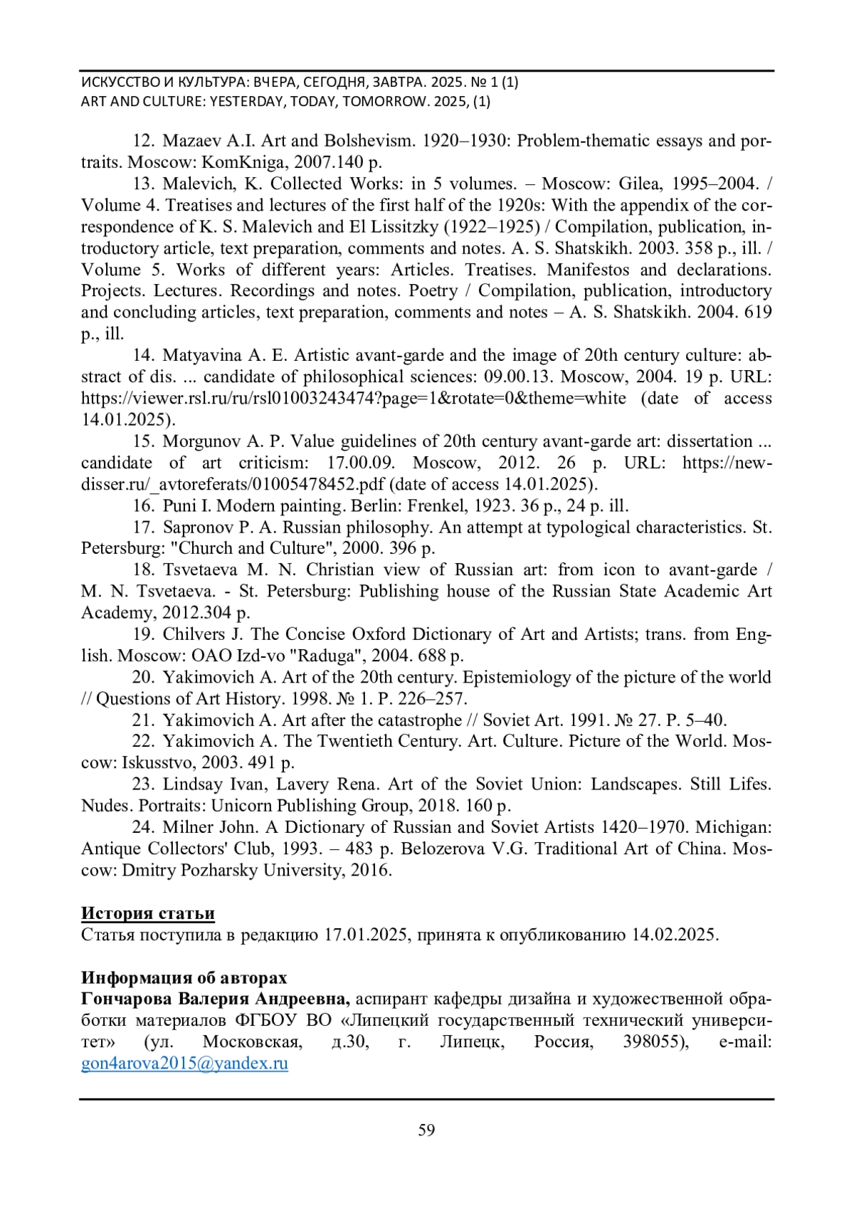 15. 	Моргунов А.П. Ценностные ориентиры искусства авангарда XX века: диссертация.. кандидата искусствоведения: 17.00.09. Москва, 2012. 26 с. URL: https://new-disser.ru/_avtoreferats/01005478452.pdf (дата обращения 14.01.2025 г.).