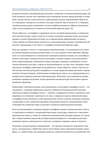 В данной статье рассматривается лигвокультурная специфика художественного текста, различные точки зрения исследователей на неё. Подробно анализируются все её основные составляющие, включающие в себя прецедентные тексты и имена, особые языковые единицы и символы национальной культуры. Результатом исследования является более точное понимание роли лингвокультурной специфики текста, а также установление связи творческого процесса создания художественного произведения, языковой личности и лингвокультуры.