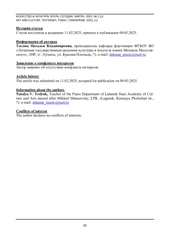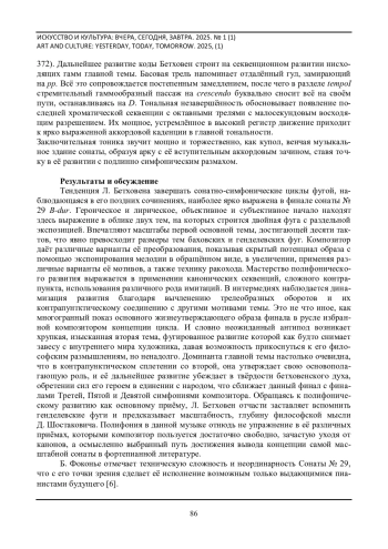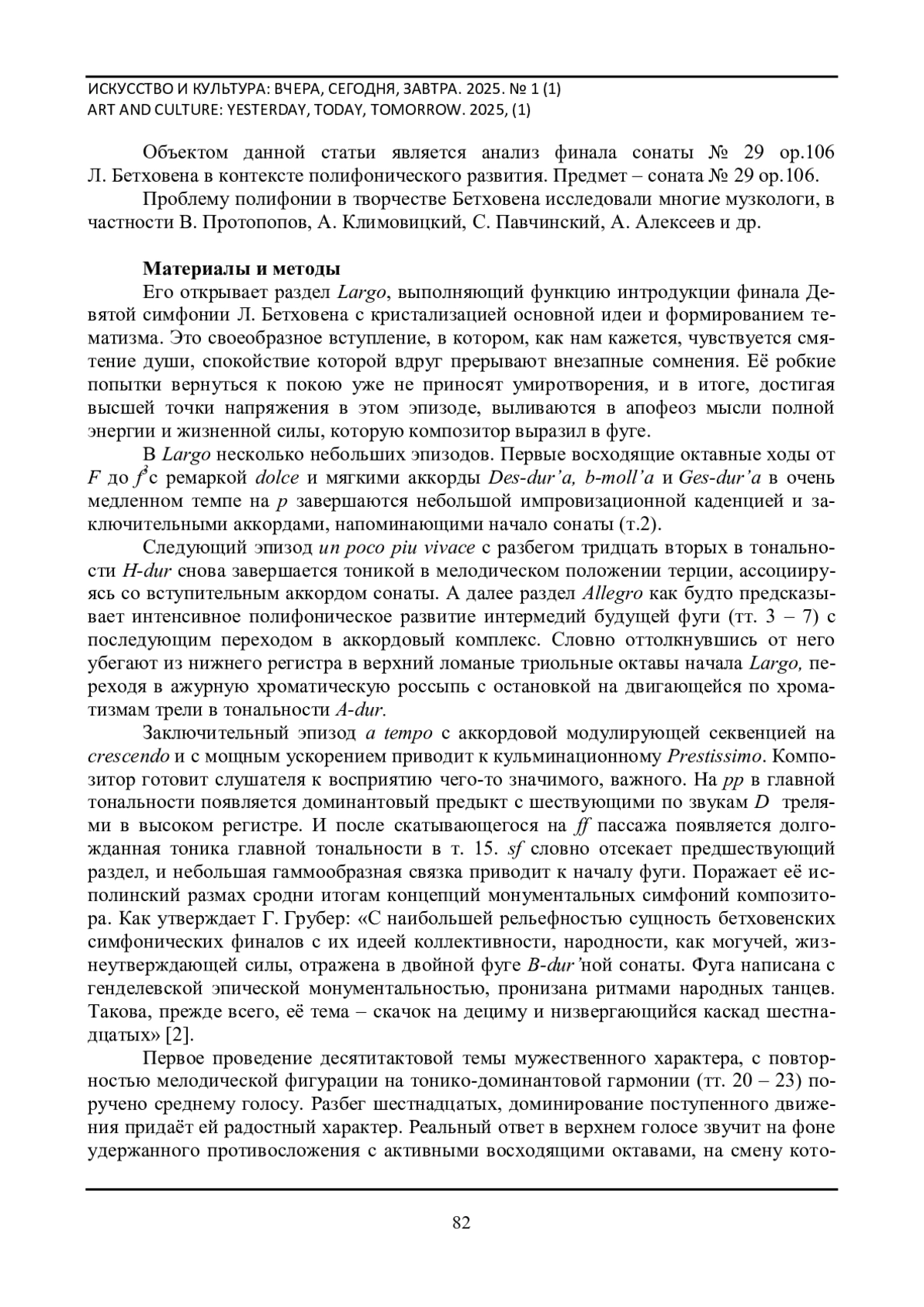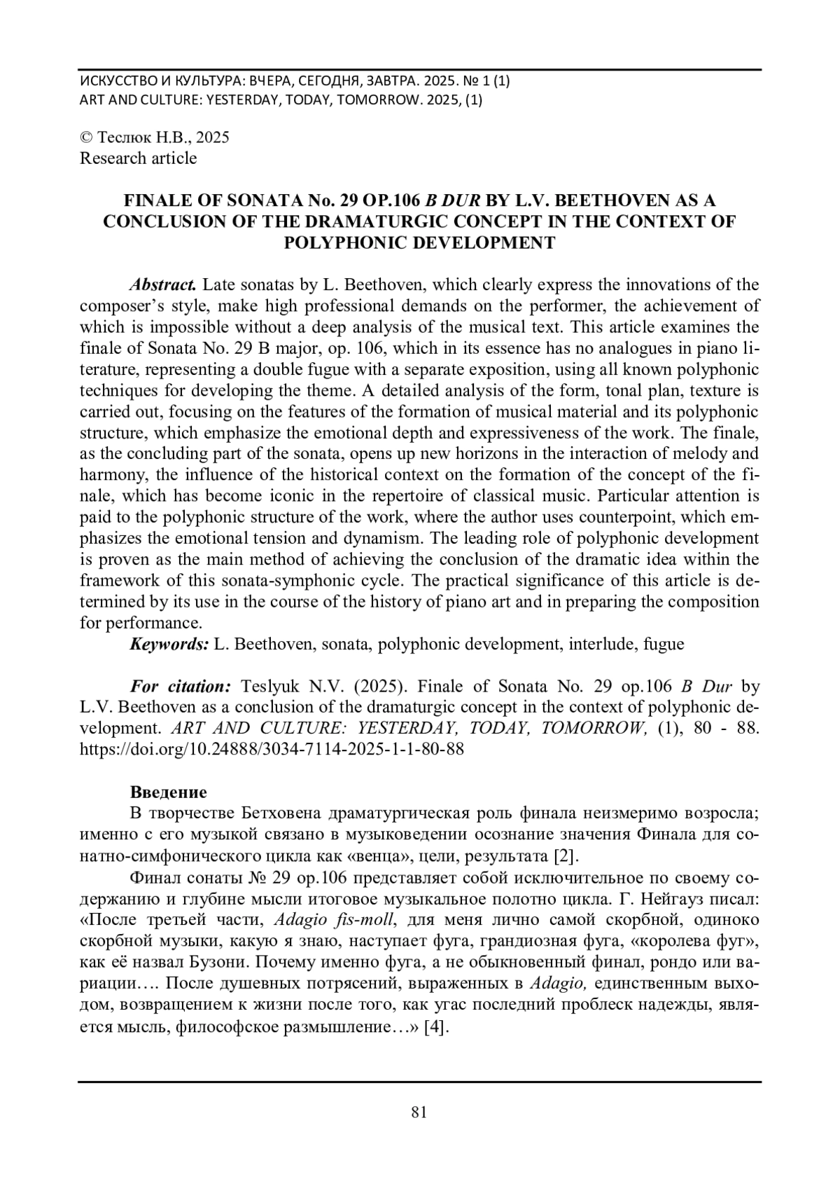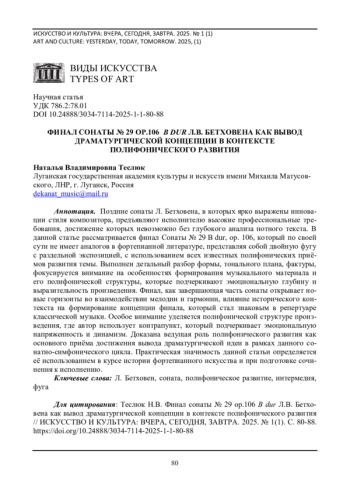 Поздние сонаты Л. Бетховена, в которых ярко выражены инновации стиля композитора, предъявляют исполнителю высокие профессиональные требования, достижение которых невозможно без глубокого анализа нотного текста. В данной статье рассматривается финал Сонаты № 29 B dur, ор. 106, который по своей сути не имеет аналогов в фортепианной литературе, представляя собой двойную фугу с раздельной экспозицией, с использованием всех известных полифонических приёмов развития темы. Выполнен детальный разбор формы, тонального плана, фактуры, фокусируется внимание на особенностях формирования музыкального материала и его полифонической структуры, которые подчеркивают эмоциональную глубину и выразительность произведения. Финал, как завершающая часть сонаты открывает новые горизонты во взаимодействии мелодии и гармонии, влияние исторического контекста на формирование концепции финала, который стал знаковым в репертуаре классической музыки. Особое внимание уделяется полифонической структуре произведения, где автор использует контрапункт, который подчеркивает эмоциональную напряженность и динамизм. Доказана ведущая роль полифонического развития как основного приёма достижения вывода драматургической идеи в рамках данного сонатно-симфонического цикла. Практическая значимость данной статьи определяется её использованием в курсе истории фортепианного искусства и при подготовке сочинения к исполнению.