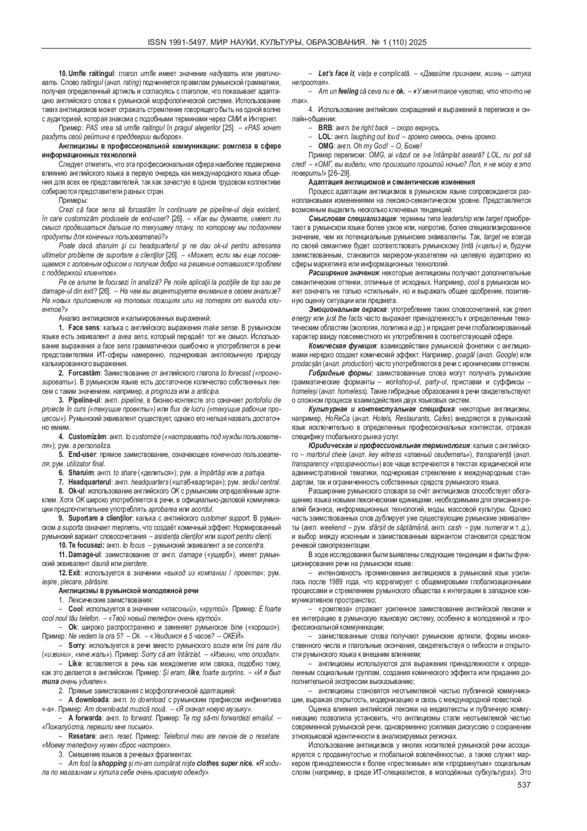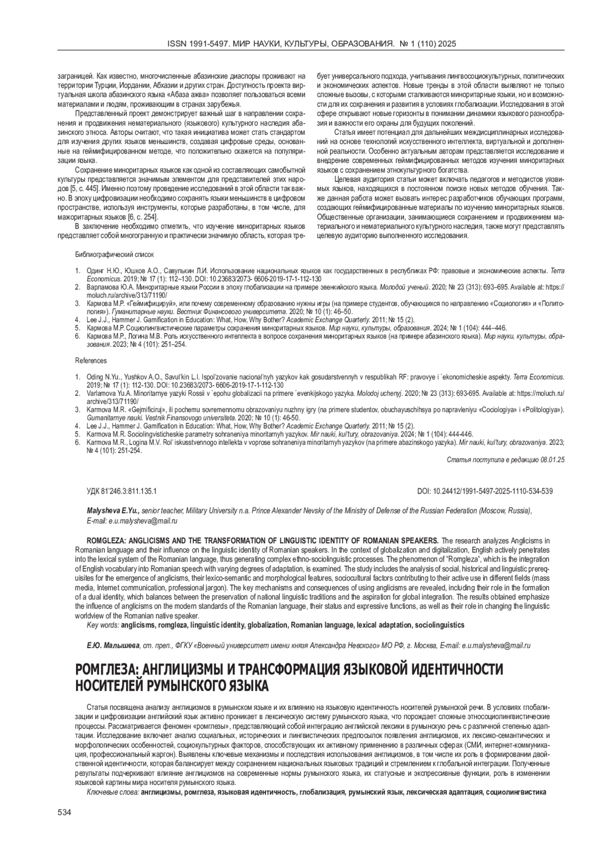 Статья посвящена анализу англицизмов в румынском языке и их влиянию на языковую идентичность носителей румынской речи. В условиях глобализации и цифровизации английский язык активно проникает в лексическую систему румынского языка, что порождает сложные этносоциолингвистические процессы. Рассматривается феномен «ромглезы», представляющий собой интеграцию английской лексики в румынскую речь с различной степенью адаптации. Исследование включает анализ социальных, исторических и лингвистических предпосылок появления англицизмов, их лексико-семантических и морфологических особенностей, социокультурных факторов, способствующих их активному применению в различных сферах (СМИ, интернет-коммуникация, профессиональный жаргон). Выявлены ключевые механизмы и последствия использования англицизмов, в том числе их роль в формировании двойственной идентичности, которая балансирует между сохранением национальных языковых традиций и стремлением к глобальной интеграции. Полученные результаты подчеркивают влияние англицизмов на современные нормы румынского языка, их статусные и экспрессивные функции, роль в изменении языковой картины мира носителя румынского языка.