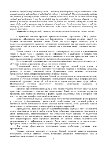 В статье рассматриваются методические аспекты преподавания химии в системе среднего профессионального образования. Описаны подходы к организации учебного процесса, методы активизации познавательной деятельности студентов, а также рекомендации для повышения качества преподавания. В работе уделяется внимание проблемным вопросам, с которыми может встретиться преподаватель в процессе обучения химии и предлагаются возможные варианты их решения. Описываются различные современные педагогические технологии, ориентирующие студентов на самостоятельный поиск решения сложных ситуаций и помогающие преподавателю повысить эффективность образовательного процесса в рамках проведения занятия по химии. Определена роль междисциплинарных предметных связей в системе образования и преподавания отдельных дисциплин. Обозреваются наиболее успешные методы и особенности обучения учащихся химическим наукам. Исходя из анализируемых методов и приемов обучения можно сделать вывод, что методика преподавания химии в системе среднего профессионального образования должна быть гибкой и адаптивной, учитывая потребности современной экономики и запросы работодателей. Определяющим фактором все же выступает деятельность преподавателя, который должен быть заинтересован в правильном и грамотном воспитании подрастающего поколения.