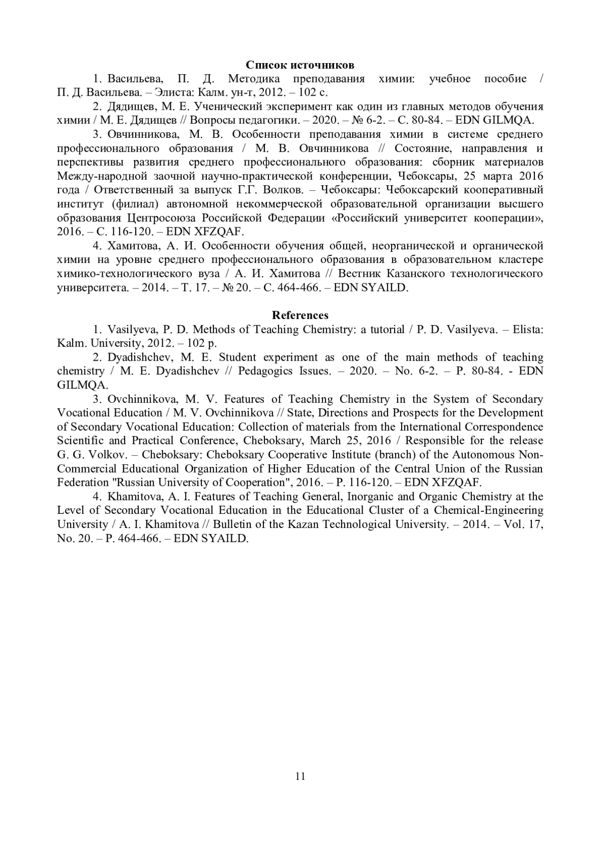 2. 	Дядищев, М. Е. Ученический эксперимент как один из главных методов обучения химии / М. Е. Дядищев // Вопросы педагогики. - 2020. - № 6-2. - С. 80-84. EDN: GILMQA