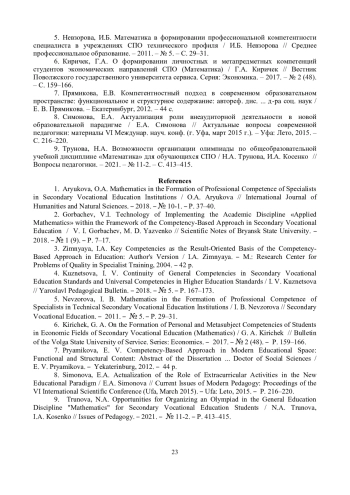 9. 	Трунова, Н.А. Возможности организации олимпиады по общеобразовательной учебной дисциплине “Математика” для обучающихся СПО / Н.А. Трунова, И.А. Косенко // Вопросы педагогики. - 2021. - № 11-2. - С. 413-415.