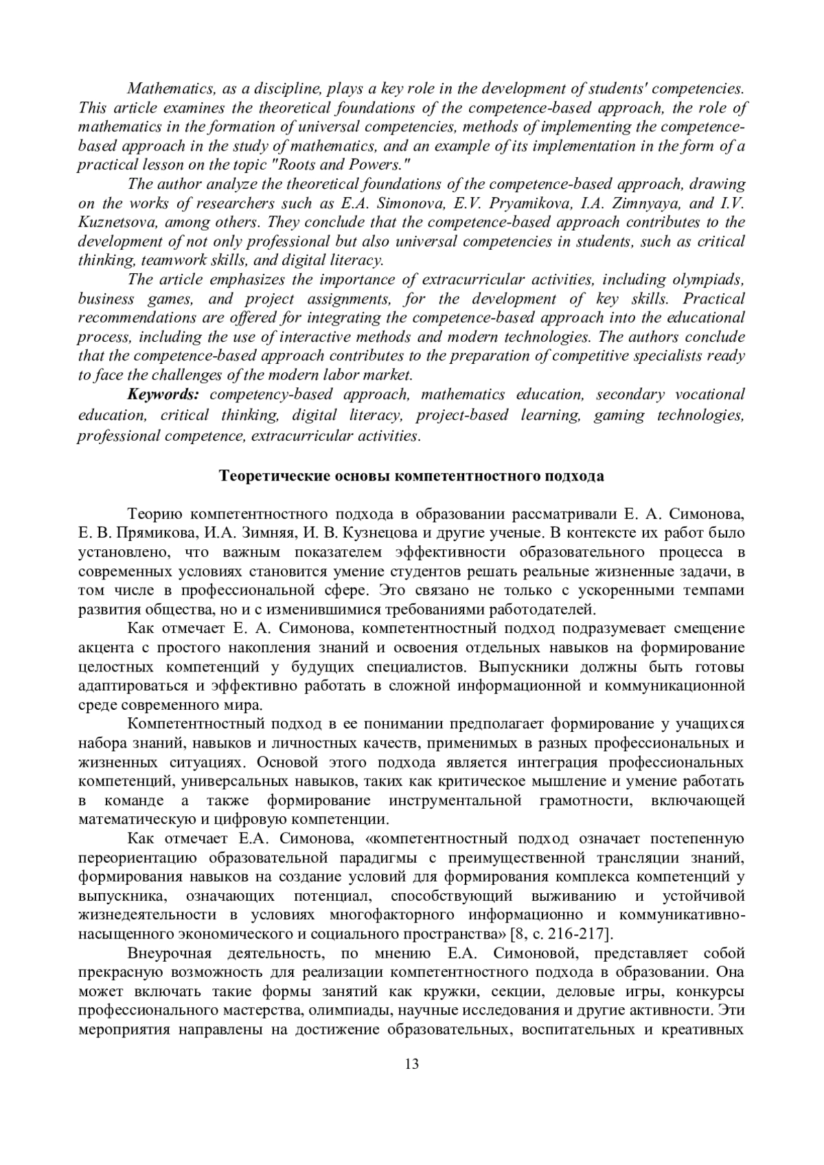 8. 	Симонова, Е.А. Актуализация роли внеаудиторной деятельности в новой образовательной парадигме / Е.А. Симонова // Актуальные вопросы современной педагогики: материалы VI Междунар. науч. конф. (г. Уфа, март 2015 г.). - Уфа: Лето, 2015. - С. 216-220.