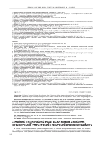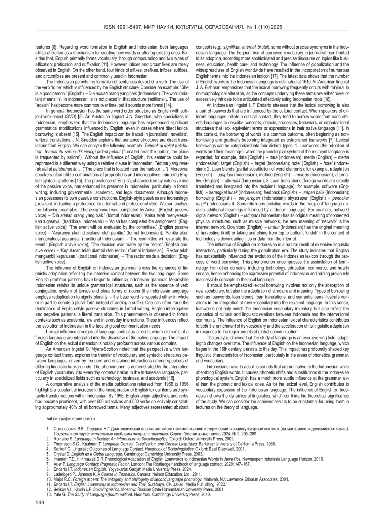 1. 	Соколовская В.В., Пердана Н.Г Диахронический анализ английских заимствований: исторический и социокультурный контекст (на материале индонезийского языка). Современная наука: актуальные проблемы теории и практики. Серия: Гуманитарные науки. 2024; № 9: 205-209. EDN: ICRWZK