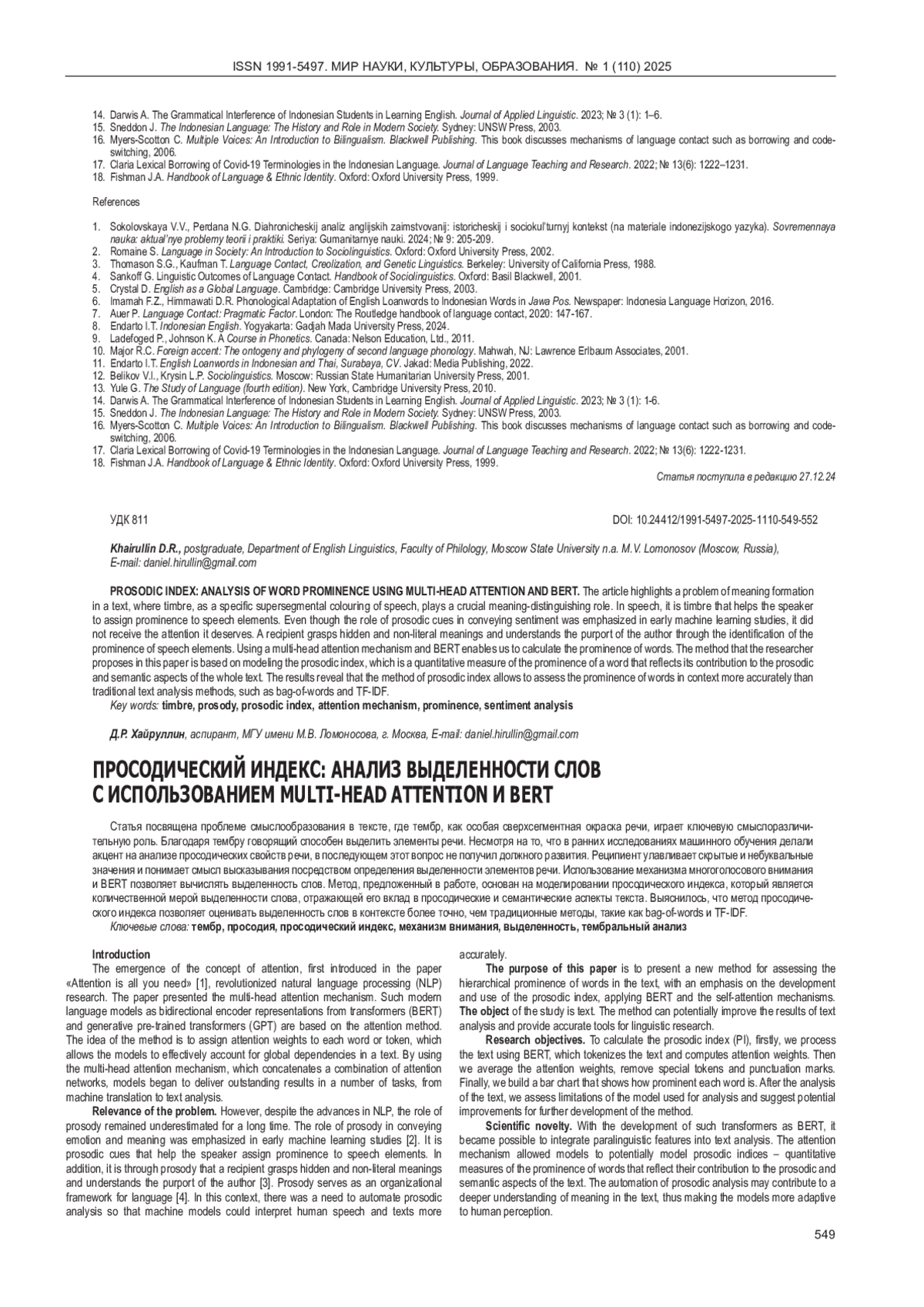 Статья посвящена проблеме смыслообразования в тексте, где тембр, как особая сверхсегментная окраска речи, играет ключевую смыслоразличи тельную роль. Благодаря тембру говорящий способен выделить элементы речи. Несмотря на то, что в ранних исследованиях машинного обучения делали акцент на анализе просодических свойств речи, в последующем этот вопрос не получил должного развития. Реципиент улавливает скрытые и небуквальные значения и понимает смысл высказывания посредством определения выделенности элементов речи. Использование механизма многоголосового внимания и BERT позволяет вычислять выделенность слов. Метод, предложенный в работе, основан на моделировании просодического индекса, который является количественной мерой выделенности слова, отражающей его вклад в просодические и семантические аспекты текста. Выяснилось, что метод просодического индекса позволяет оценивать выделенность слов в контексте более точно, чем традиционные методы, такие как bag-of-words и TF-IDF.