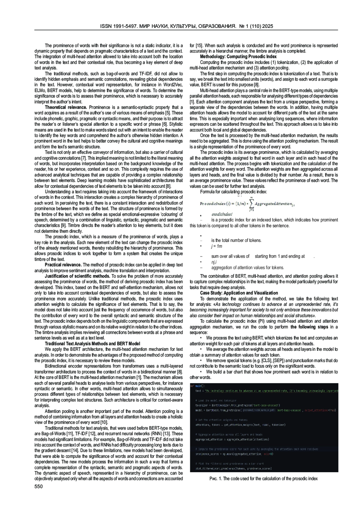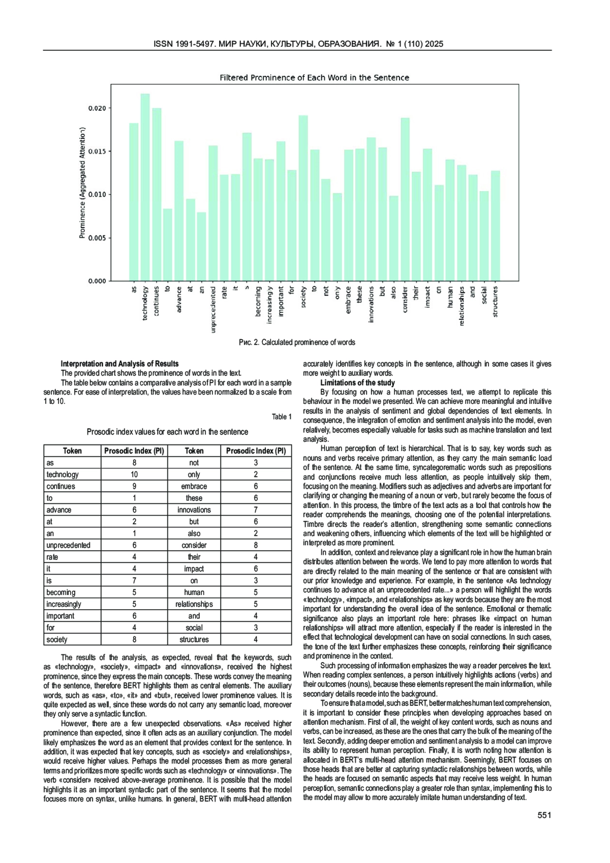 Статья посвящена проблеме смыслообразования в тексте, где тембр, как особая сверхсегментная окраска речи, играет ключевую смыслоразличи тельную роль. Благодаря тембру говорящий способен выделить элементы речи. Несмотря на то, что в ранних исследованиях машинного обучения делали акцент на анализе просодических свойств речи, в последующем этот вопрос не получил должного развития. Реципиент улавливает скрытые и небуквальные значения и понимает смысл высказывания посредством определения выделенности элементов речи. Использование механизма многоголосового внимания и BERT позволяет вычислять выделенность слов. Метод, предложенный в работе, основан на моделировании просодического индекса, который является количественной мерой выделенности слова, отражающей его вклад в просодические и семантические аспекты текста. Выяснилось, что метод просодического индекса позволяет оценивать выделенность слов в контексте более точно, чем традиционные методы, такие как bag-of-words и TF-IDF.