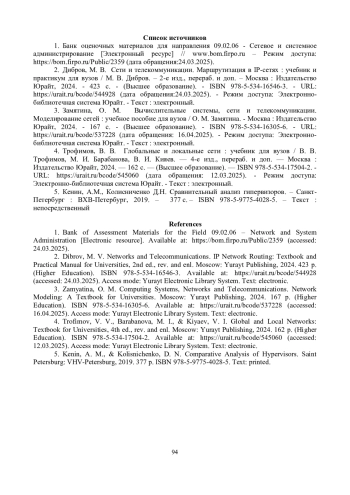 3. Замятина, О. М. Вычислительные системы, сети и телекоммуникации. Моделирование сетей: учебное пособие для вузов / О. М. Замятина. - Москва: Издательство Юрайт, 2024. - 167 с. - (Высшее образование). - URL: https://urait.ru/bcode/537228 (дата обращения: 16.04.2025). - Режим доступа: Электронно-библиотечная система Юрайт. - Текст: электронный. ISBN: 978-5-534-16305-6
