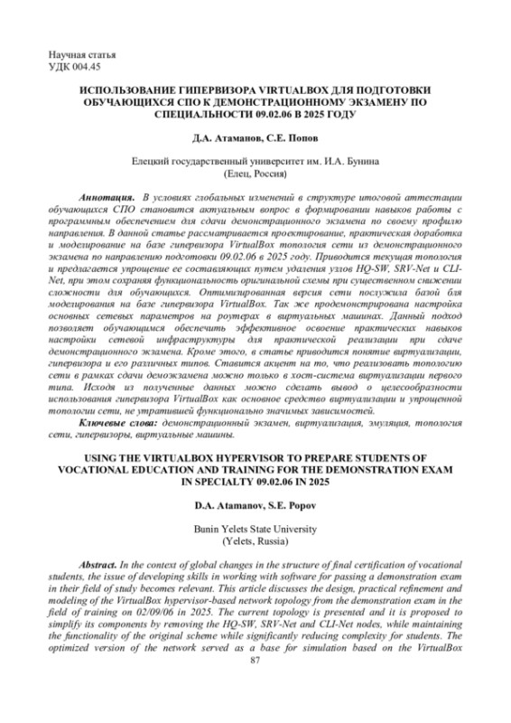 В условиях глобальных изменений в структуре итоговой аттестации обучающихся СПО становится актуальным вопрос в формировании навыков работы с программным обеспечением для сдачи демонстрационного экзамена по своему профилю направления. В данной статье рассматривается проектирование, практическая доработка и моделирование на базе гипервизора VirtualBox топология сети из демонстрационного экзамена по направлению подготовки 09.02.06 в 2025 году. Приводится текущая топология и предлагается упрощение ее составляющих путем удаления узлов HQ-SW, SRV-Net и CLI-Net, при этом сохраняя функциональность оригинальной схемы при существенном снижении сложности для обучающихся. Оптимизированная версия сети послужила базой бля моделирования на базе гипервизора VirtualBox. Так же продемонстрирована настройка основных сетевых параметров на роутерах в виртуальных машинах. Данный подход позволяет обучающимся обеспечить эффективное освоение практических навыков настройки сетевой инфраструктуры для практической реализации при сдаче демонстрационного экзамена. Кроме этого, в статье приводится понятие виртуализации, гипервизора и его различных типов. Ставится акцент на то, что реализовать топологию сети в рамках сдачи демоэкзамена можно только в хост-система виртуализации первого типа. Исходя из полученные данных можно сделать вывод о целесообразности использования гипервизора VirtualBox как основное средство виртуализации и упрощенной топологии сети, не утратившей функционально значимых зависимостей.