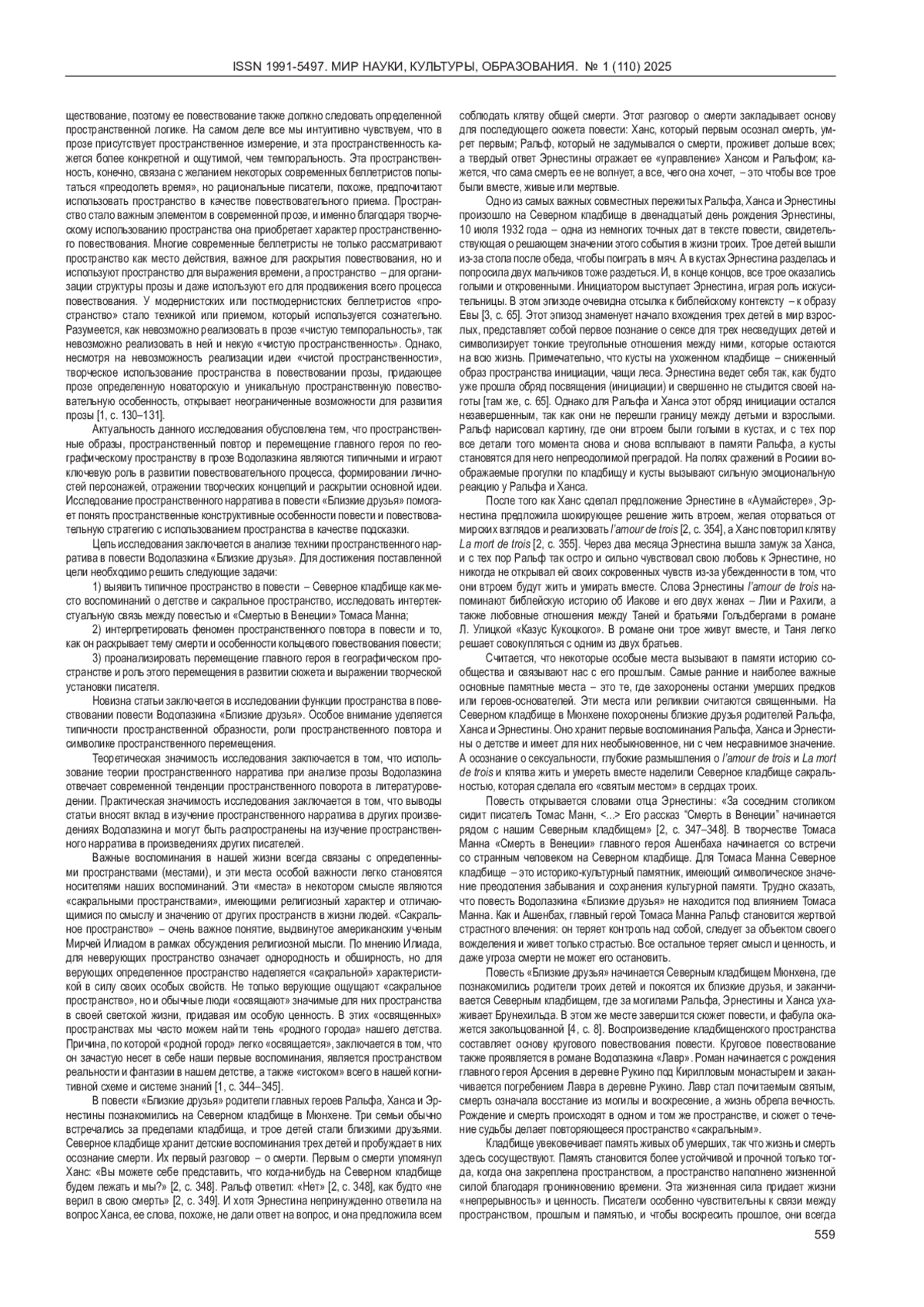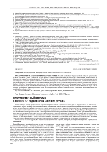 Статья посвящена анализу пространственной нарративной стратегии повести Водолазкина «Близкие друзья», сосредоточившись на типичных пространственных образах, феномене пространственного повтора и перемещении главных героев в пространстве. Важнейшим топосом в повести «Близкие друзья» является Северное кладбище, которое для трех главных героев является местом и предметом воспоминаний детства, сакральным пространством, имеющим для них исключительное значение, а также пространством культурной памяти в повести Томаса Манна «Смерть в Венеции», благодаря чему эти два текста вступают в интертекстуальную связь. С пространством кладбища в качестве ядра повесть разворачивает круговое повествование через повторение пространства и деталей, воплощая тему потока судьбы и круговорота смерти. И перед лицом круговорота смерти главный герой постоянно перемещается в географическом пространстве, осмысливая войну и историю, поминая своих близких друзей и сдерживая клятву, добиваясь перестройки своей личности. В статье делается вывод о том, что пространство в повести Водолазкина «Близкие друзья» играет важную роль в развитии сюжета, выделении темы повествования, формировании структуры повествования и является одним из ключевых элементов, составляющих повесть в целом.