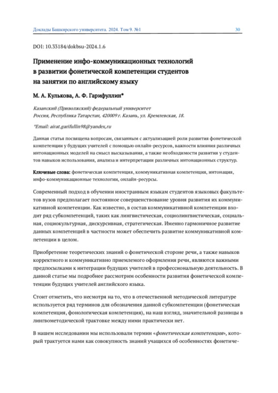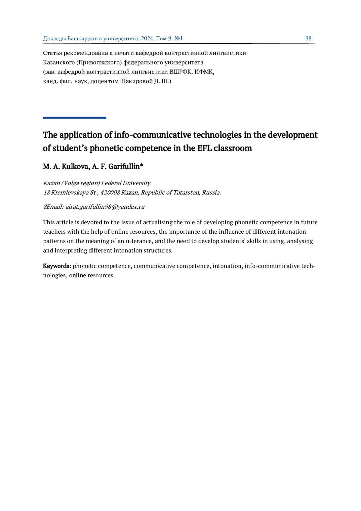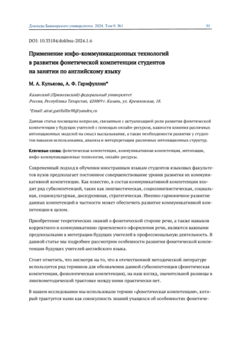 Данная статья посвящена вопросам, связанным с актуализацией роли развития фонетической компетенции у будущих учителей с помощью онлайн-ресурсов, важности влияния различных интонационных моделей на смысл высказывания, а также необходимости развития у студентов навыков использования, анализа и интерпретации различных интонационных структур.