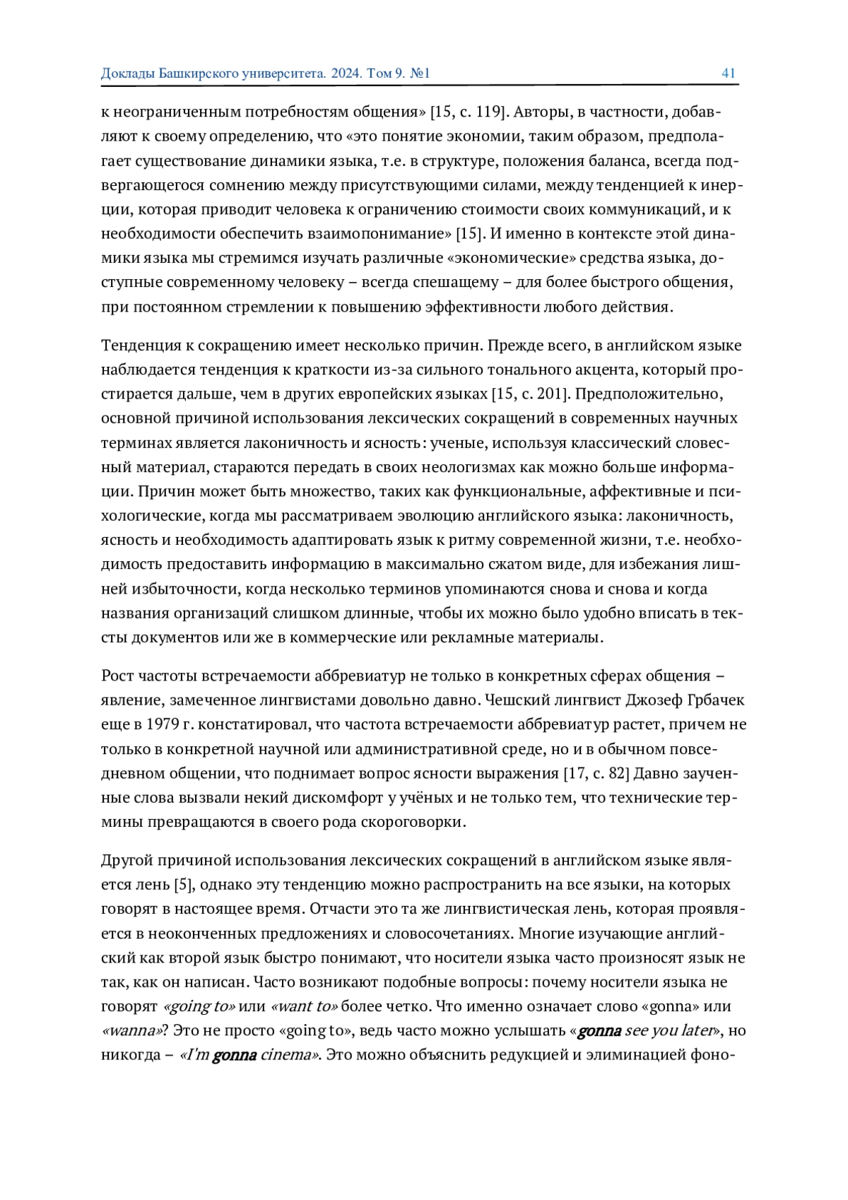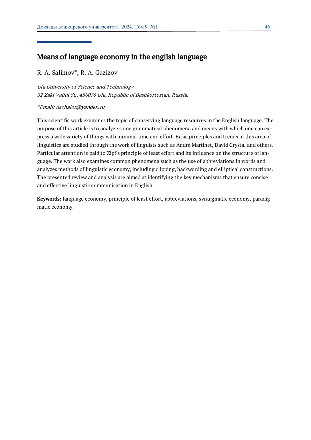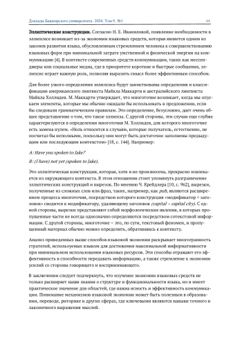 В данной научной работе рассматривается тема экономии языковых средств в английском языке. Целью данной статьи является анализ некоторых грамматических явлений и средств, с помощью которых можно выразить самые разнообразные вещи с минимальными затратами времени и усилий. Основные принципы и тенденции в данной области лингвистики изучаются с помощью работ таких лингвистов, как Андре Мартине, Дэвидa Кристала и др. Особое внимание уделяется принципу наименьших усилий Ципфа и его влиянию на структуру языка. Работа также рассматривает распространенные явления, такие как использование сокращений в словах, анализирует методы языковой экономии, включая отсечение, обратное словообразование и эллиптические конструкции. Представленный обзор и анализ направлены на выявление ключевых механизмов, обеспечивающих лаконичное и эффективное языковое общение в английском языке.