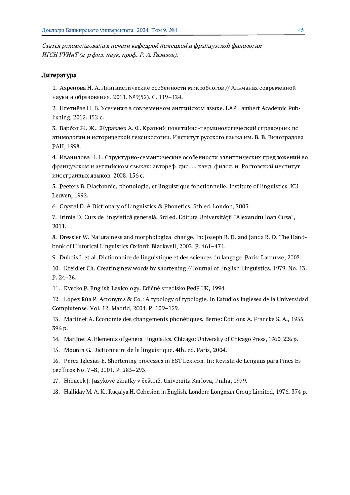 10. 	Kreidler Ch. Creating new words by shortening // Journal of English Linguistics. 1979. No. 13. Р. 24-36. EDN: JRTNDX