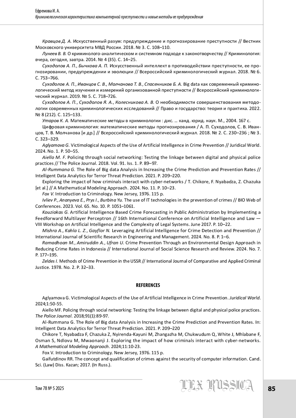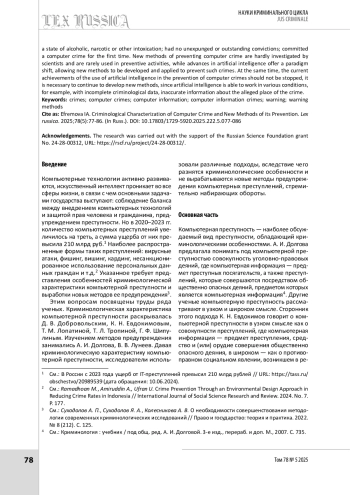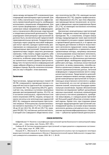 6. Суходолов А. П., Бычкова А. П. Искусственный интеллект в противодействии преступности, ее прогнозировании, предупреждении и эволюции // Всероссийский криминологический журнал. 2018. № 6. С. 753-766.