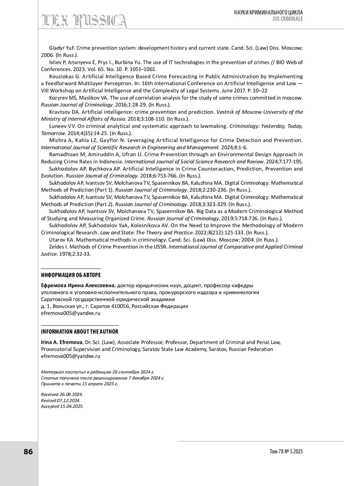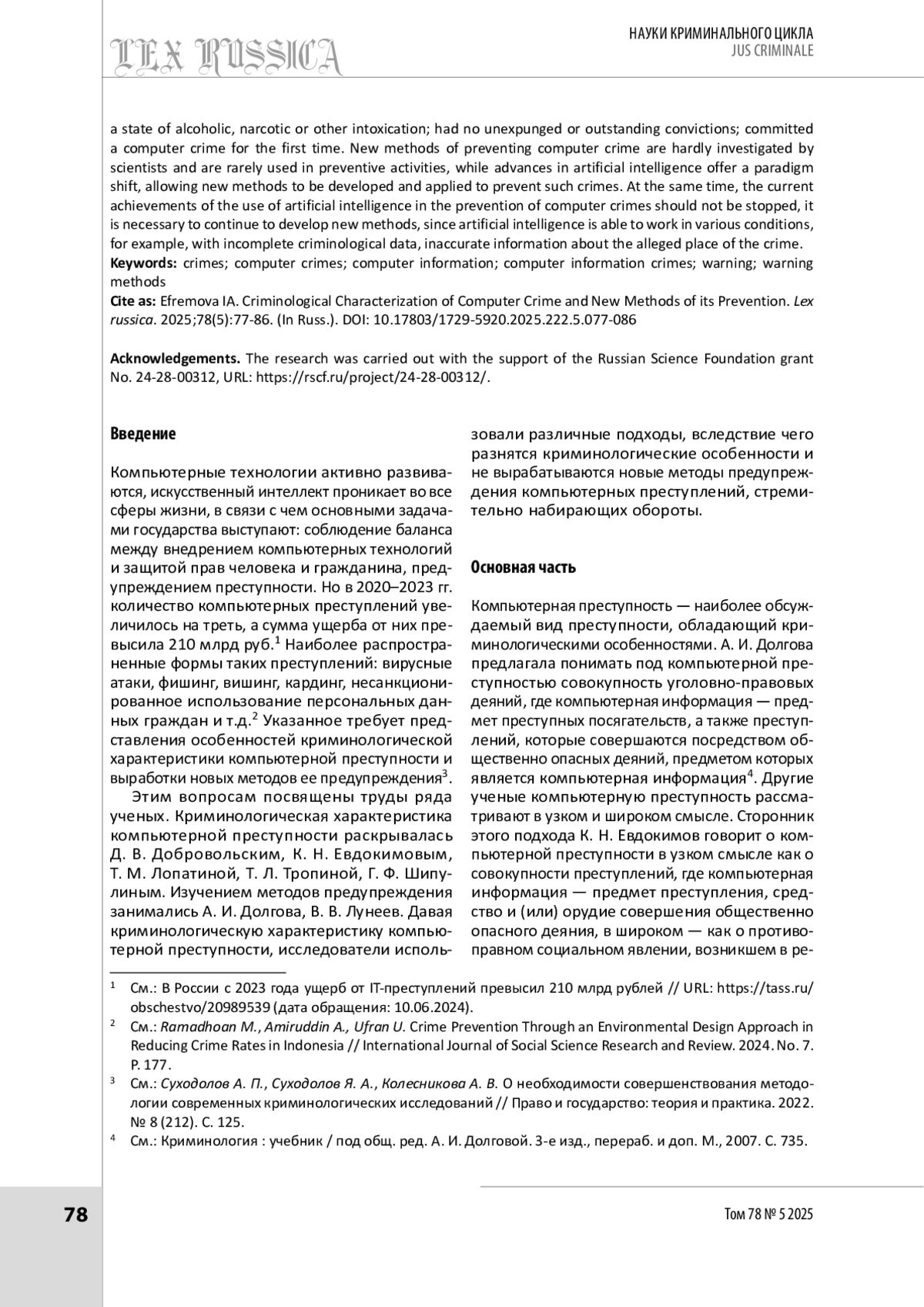 7. Суходолов А. П., Иванцов С. В., Молчанова Т. В., Спасенников Б. А. Big data как современный криминологический метод изучения и измерений организованной преступности // Всероссийский криминологический журнал. 2019. № 5. С. 718-726.